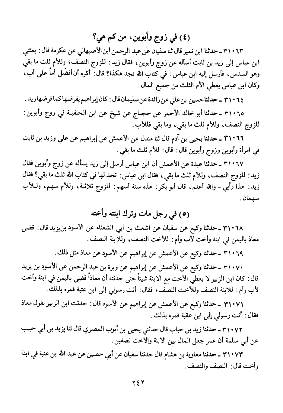 31073 - حَدَّثَنَا مُعَاوِيَةُ بْنُ هِشَامٍ قَالَ: حَدَّثَنَا سُفْيَانُ، عَنْ أَبِي حُصَيْنٍ، عَنْ عَبْدِ اللَّهِ بْنِ عُتْبَةَ §فِي ابْنَةٍ وَأُخْتٍ قَالَ: «النِّصْفُ وَالنِّصْفُ»