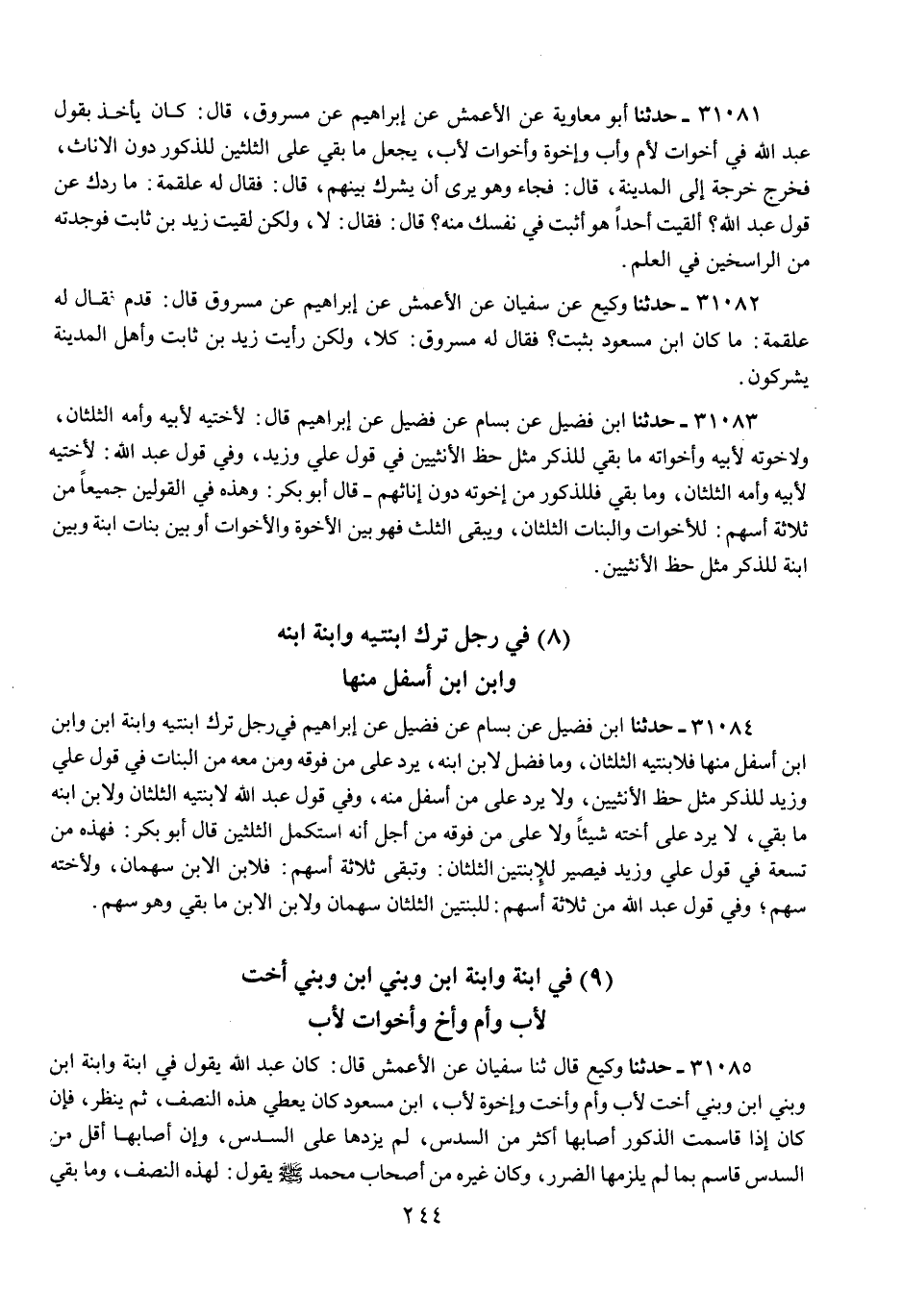 31085 - حَدَّثَنَا وَكِيعٌ قَالَ: ثنا سُفْيَانُ، عَنِ الْأَعْمَشِ قَالَ: كَانَ عَبْدُ اللَّهِ يَقُولُ فِي ابْنَةٍ وَابْنَةِ ابْنٍ وَبَنِي ابْنٍ وَبَنِي أُخْتٍ لِأَبٍ وَأُمٍّ وَأُخْتٍ وَإِخْوَةٍ لِأَبٍ، §ابْنُ مَسْعُودٍ كَانَ يُعْطِي هَذِهِ النِّصْفَ، ثُمَّ يَنْظُرُ فَإِنْ كَانَ إِذَا قَاسَمَتِ الذُّكُورَ أَصَابَهَا أَكْثَرُ مِنَ السُّدُسِ، لَمْ يُزِدْهَا عَلَى السُّدُسِ، وَإِنْ أَصَابَهَا أَقَلُّ مِنَ السُّدُسِ قَاسَمَ بِمَا لَمْ يُلْزِمْهَا الضَّرَرُ، وَكَانَ غَيْرُهُ مِنْ أَصْحَابِ مُحَمَّدٍ صَلَّى اللهُ عَلَيْهِ وَسَلَّمَ يَقُولُ: «لِهَذِهِ النِّصْفُ، وَمَا بَقِيَ فَلِلذَّكَرِ مِثْلُ حَظِّ الْأُنْثَيَيْنِ» قَالَ أَبُو بَكْرٍ: «هَذِهِ أَصْلُهَا مِنْ سِتَّةِ أَسْهُمٍ»