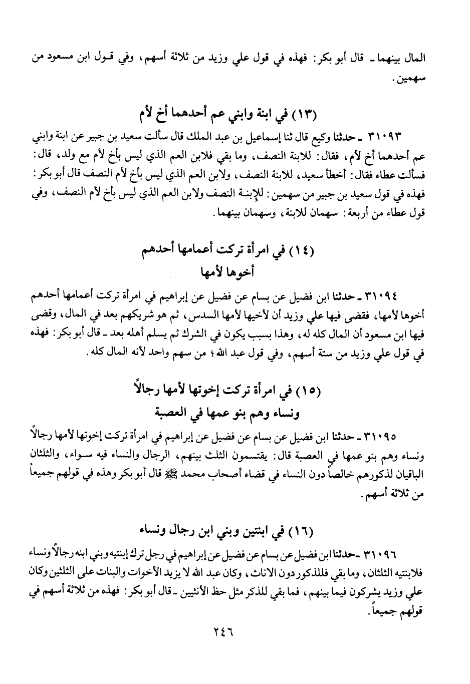 31096 - حَدَّثَنَا ابْنُ فُضَيْلٍ، عَنْ بَسَّامٍ، عَنْ فُضَيْلٍ، عَنْ إِبْرَاهِيمَ، §فِي رَجُلٍ تَرَكَ ابْنَتَيْهِ وَبَنِي ابْنِهِ رِجَالًا وَنِسَاءً فَلِابْنَتَيْهِ الثُّلُثَانِ، وَمَا بَقِيَ فَلِلذُّكُورِ دُونَ الْإِنَاثِ، وَكَانَ عَبْدُ اللَّهِ «لَا يَزِيدُ الْأَخَوَاتِ وَالْبَنَاتِ عَلَى الثُّلُثَيْنِ»، وَكَانَ عَلِيٌّ، وَزَيْدٌ «يُشْرِكُونَ فِيمَا بَيْنَهُمْ، فَمَا بَقِيَ لِلذَّكَرِ مِثْلُ حَظِّ الْأُنْثَيَيْنِ» قَالَ أَبُو بَكْرٍ: «فَهَذِهِ مِنْ ثَلَاثَةِ أَسْهُمٍ فِي قَوْلِهِمْ جَمِيعًا»