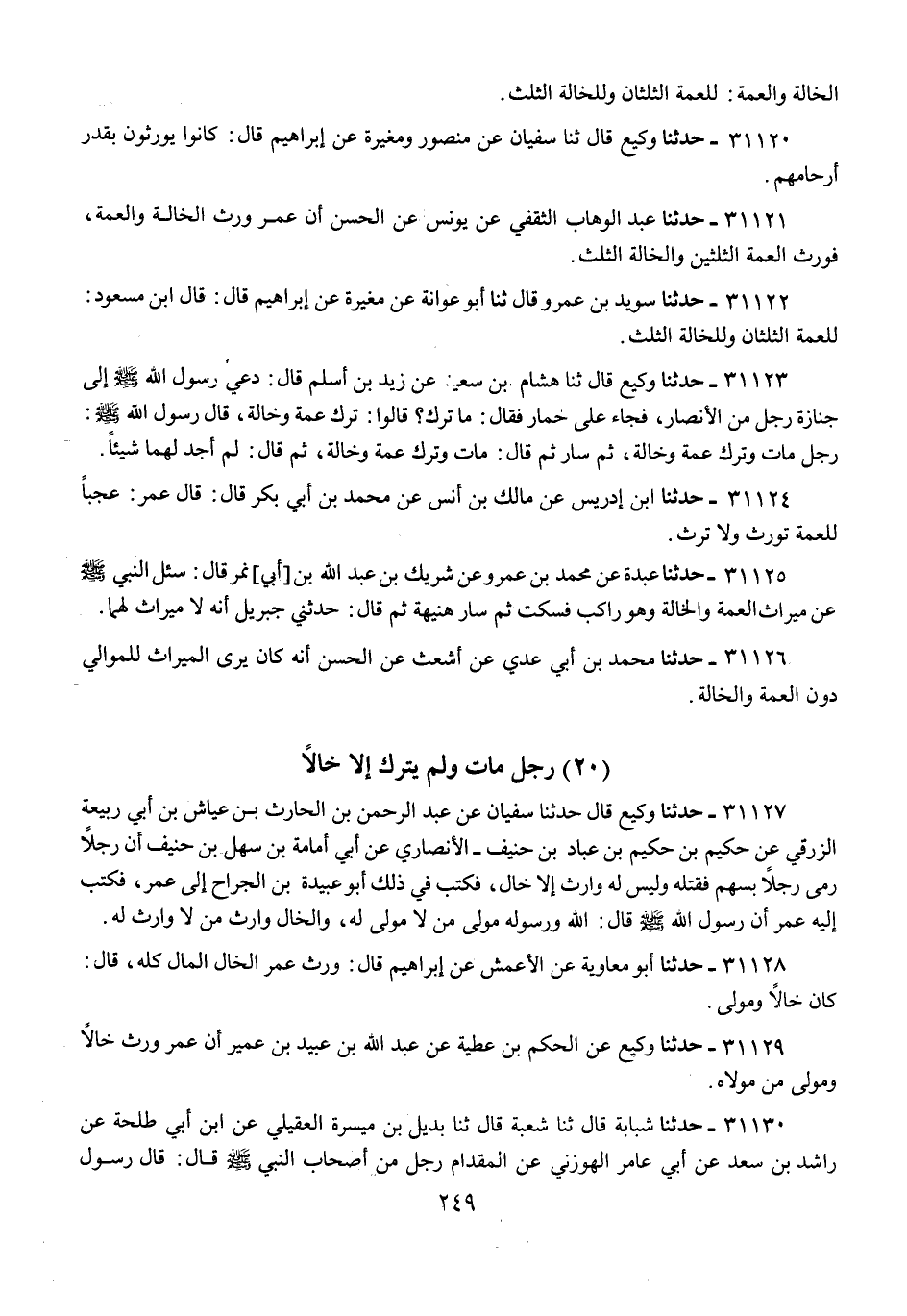 31127 - حَدَّثَنَا وَكِيعٌ، قَالَ: حَدَّثَنَا سُفْيَانُ، عَنْ عَبْدِ الرَّحْمَنِ بْنِ الْحَارِثِ بْنِ عَيَّاشِ بْنِ أَبِي رَبِيعَةَ الزُّرَقِيِّ، عَنْ حَكِيمِ بْنِ حَكِيمِ بْنِ عَبَّادِ بْنِ حُنَيْفٍ الْأَنْصَارِيِّ، عَنْ أَبِي أُمَامَةَ بْنِ سَهْلِ بْنِ حُنَيْفٍ، أَنَّ رَجُلًا رَمَى رَجُلًا بِسَهْمٍ فَقَتَلَهُ وَلَيْسَ لَهُ وَارِثٌ إِلَّا خَالٌ، فَكَتَبَ فِي ذَلِكَ أَبُو عُبَيْدَةَ بْنُ الْجَرَّاحِ إِلَى عُمَرَ، فَكَتَبَ إِلَيْهِ عُمَرُ أَنَّ رَسُولَ اللَّهِ صَلَّى اللهُ عَلَيْهِ وَسَلَّمَ، قَالَ: «§اللَّهُ وَرَسُولُهُ، مَوْلَى مَنْ لَا مَوْلَى لَهُ، وَالْخَالُ وَارِثُ مَنْ لَا وَارِثَ لَهُ»