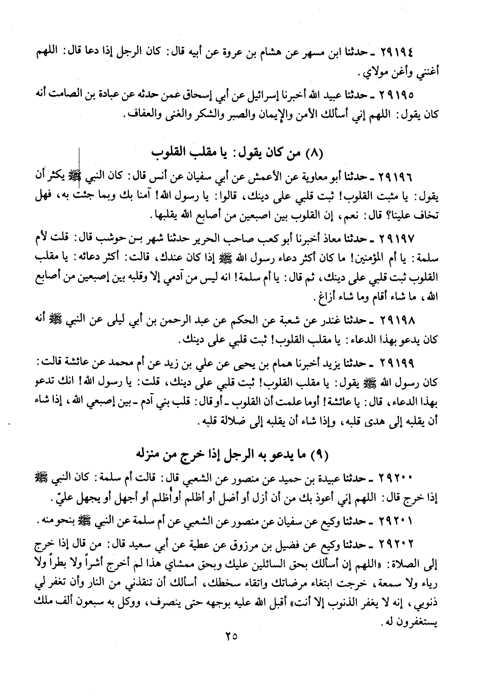 29200 - حَدَّثَنَا عَبِيدَةُ بْنُ حُمَيْدٍ، عَنْ مَنْصُورٍ، عَنِ الشَّعْبِيِّ، قَالَ: قَالَتْ أُمُّ سَلَمَةَ: كَانَ النَّبِيُّ صَلَّى اللهُ عَلَيْهِ وَسَلَّمَ §إِذَا خَرَجَ قَالَ: «اللَّهُمَّ إِنِّي أَعُوذُ بِكَ مِنْ أَنْ أَزِلَّ أَوْ أَضِلَّ، أَوْ أَظْلِمَ أَوْ أُظْلَمَ، أَوْ أَجْهَلَ أَوْ يُجْهَلَ عَلَيَّ»