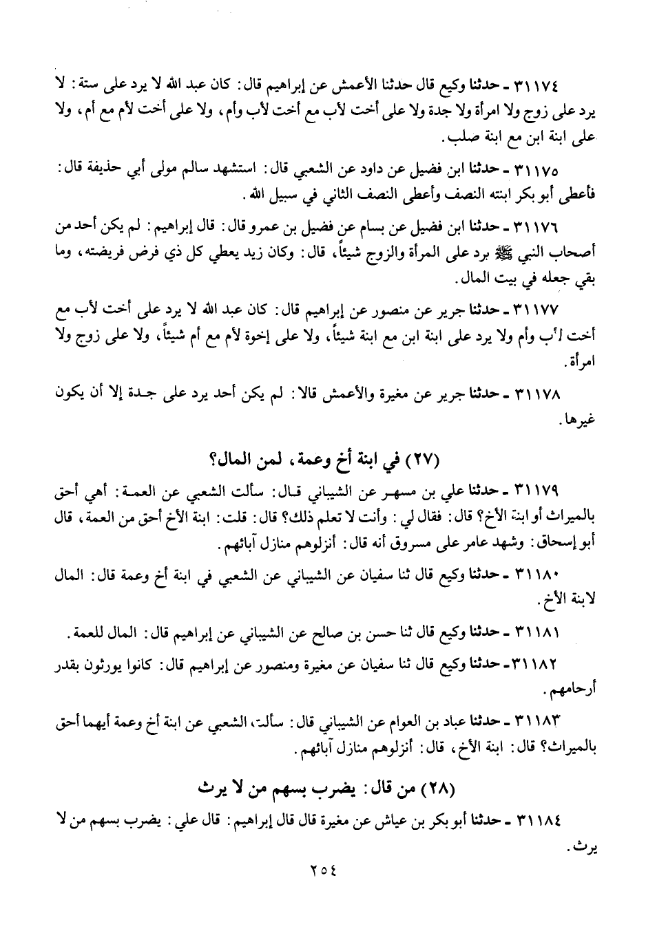 31174 - حَدَّثَنَا وَكِيعٌ، قَالَ: حَدَّثَنَا الْأَعْمَشُ، عَنْ إِبْرَاهِيمَ، قَالَ: كَانَ عَبْدُ اللَّهِ لَا يَرُدُّ عَلَى سِتَّةٍ: «§لَا يَرُدُّ عَلَى زَوْجٍ، وَلَا امْرَأَةٍ، وَلَا جَدَّةٍ، وَلَا عَلَى أُخْتٍ لِأَبٍ مَعَ أُخْتٍ لِأَبٍ وَأَمٍّ، وَلَا عَلَى أُخْتٍ لِأُمٍّ مَعَ أُمٍّ، وَلَا عَلَى ابْنَةِ ابْنٍ مَعَ ابْنَةِ صُلْبٍ»