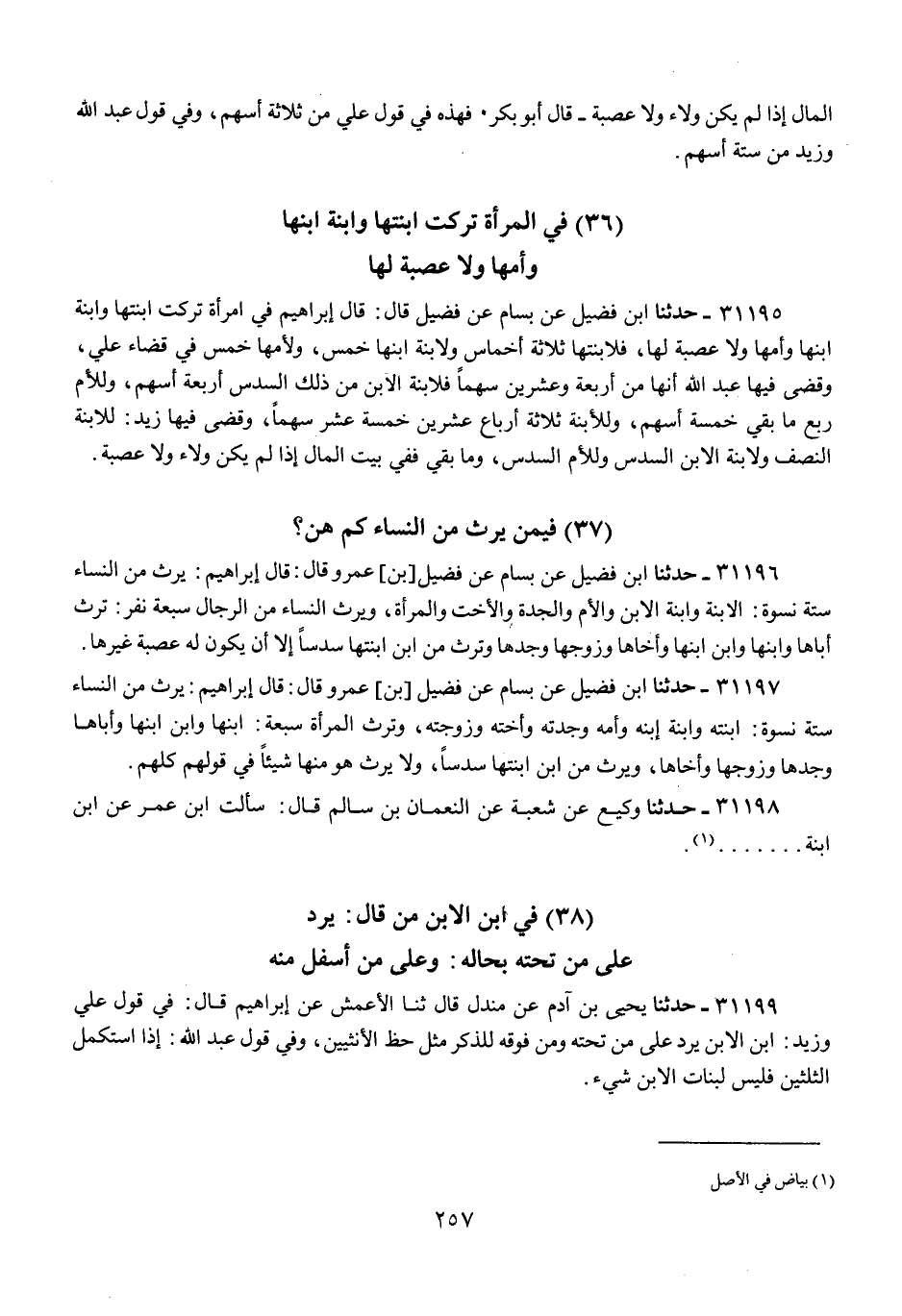 31195 - حَدَّثَنَا ابْنُ فُضَيْلٍ، عَنْ بَسَّامٍ، عَنْ فُضَيْلٍ، قَالَ: قَالَ إِبْرَاهِيمُ فِي امْرَأَةٍ تَرَكَتِ ابْنَتَهَا وَابْنَةَ ابْنِهَا وَأُمَّهَا وَلَا عَصَبَةَ لَهَا، «§فَلِابْنَتِهَا ثَلَاثَةُ أَخْمَاسٍ وَلِابْنَةِ ابْنِهَا خُمُسٌ، وَلِأُمِّهَا خُمُسٌ» فِي قَضَاءِ عَلِيٍّ، وَقَضَى فِيهَا عَبْدُ اللَّهِ «أَنَّهَا مِنْ أَرْبَعَةٍ وَعِشْرِينَ سَهْمًا فَلِابْنَةِ الِابْنِ مِنْ ذَلِكَ السُّدُسُ أَرْبَعَةُ أَسْهُمٍ، وَلِلْأُمِّ رُبْعُ مَا بَقِيَ خَمْسَةُ أَسْهُمٍ، وَلِلِابْنَةِ ثَلَاثَةُ أَرْبَاعِ عِشْرِينَ خَمْسَةَ عَشَرَ سَهْمًا»، وَقَضَى فِيهَا زَيْدٌ: «لِلِابْنَةِ النِّصْفُ وَلِابْنَةِ الِابْنِ السُّدُسُ وَلِلْأُمِّ السُّدُسُ، وَمَا بَقِيَ فَفِي بَيْتِ الْمَالِ إِذَا لَمْ يَكُنْ وَلَاءٌ، وَلَا عَصَبَةٌ»
