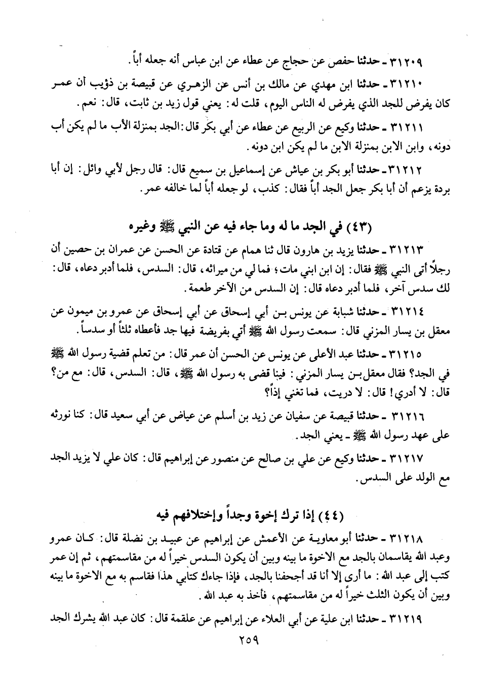 31217 - حَدَّثَنَا وَكِيعٌ، عَنْ عَلِيِّ بْنِ صَالِحٍ، عَنْ مَنْصُورٍ، عَنْ إِبْرَاهِيمَ، قَالَ: كَانَ عَلِيٌّ «§لَا يَزِيدُ الْجَدَّ مَعَ الْوَلَدِ عَلَى السُّدُسِ»