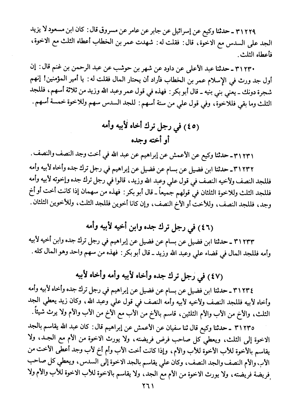 31235 - حَدَّثَنَا وَكِيعٌ، قَالَ: ثنا سُفْيَانُ، عَنِ الْأَعْمَشِ، عَنْ إِبْرَاهِيمَ، قَالَ: كَانَ عَبْدُ اللَّهِ «§يُقَاسِمُ بِالْجَدِّ الْإِخْوَةَ إِلَى الثُّلُثِ، وَيُعْطِي كُلَّ صَاحِبِ فَرْضٍ فَرِيضَتَهُ، وَلَا يُوَرِّثُ الْإِخْوَةَ مِنَ الْأُمِّ مَعَ الْجَدِّ، وَلَا يُقَاسِمُ بِالْإِخْوَةِ لِلْأَبِ الْإِخْوَةَ لِلْأَبِ وَالْأُمِّ، وَإِذَا كَانَتْ أُخْتٌ لِأَبٍ وَأَمُّ وَأَخٌ لِأَبٍ وَجَدٌّ أَعْطَى الْأُخْتَ مِنَ الْأَبِ وَالْأُمِّ النِّصْفَ وَالْجَدَّ النِّصْفَ»، وَكَانَ عَلِيٌّ «يُقَاسِمُ بِالْجَدِّ الْإِخْوَةَ إِلَى السُّدُسِ، وَيُعْطِي كُلَّ صَاحِبِ فَرِيضَةٍ فَرِيضَتَهُ، وَلَا يُوَرِّثُ الْإِخْوَةَ مِنَ الْأُمِّ مَعَ الْجَدِّ، وَلَا يُقَاسِمُ بِالْإِخْوَةِ لِلْأَبِ الْإِخْوَةَ لِلْأَبِ وَالْأُمِّ وَلَا -[262]- يَزِيدُ الْجَدَّ مَعَ الْوَلَدِ عَلَى السُّدُسِ إِلَّا أَنْ لَا يَكُونَ غَيْرَهُ، فَإِذَا كَانَتْ أُخْتٌ لِأَبٍ وَأَمٍّ وَأَخٌ لِأَبٍ وَجَدٌّ أَعْطَى الْأُخْتَ النِّصْفَ، وَجَعَلَ النِّصْفَ بَيْنَ الْجَدِّ وَالْأَخِ»، وَكَانَ زَيْدٌ «يُقَاسِمُ بِالْجَدِّ الْإِخْوَةَ وَالْأَخَوَاتِ إِلَى الثُّلُثِ، فَإِذَا بَلَغَ الثُّلُثَ أَعْطَاهُ الثُّلُثَ، وَكَانَ لِلْإِخْوَةِ وَالْأَخَوَاتِ مَا بَقِيَ، وَلَا يُوَرِّثُ الْإِخْوَةَ مِنَ الْأُمِّ مَعَ الْجَدِّ وَلَا يُقَاسِمُ بِهِمْ، وَكَانَ يُقَاسِمُ بِالْإِخْوَةِ لِلْأَبِ الْإِخْوَةَ لِلْأَبِ وَالْأُمِّ وَلَا يُوَرِّثُهُمْ شَيْئًا، وَإِذَا كَانَتْ أُخْتٌ لِأَبٍ وَأَمٍّ وَأَخٌ وَأُخْتٌ لِأَبٍ وَجَدٌّ أَعْطَى الْأُخْتَ مِنَ الْأَبِ وَالْأُمِّ النِّصْفَ، وَقَاسَمَ بِالْأَخِ وَالْأُخْتِ الْجَدَّ». قَالَ أَبُو بَكْرٍ: فَهَذِهِ فِي قَوْلِ عَلِيٍّ وَعَبْدِ اللَّهِ مِنْ سَهْمَيْنِ، وَفِي قَوْلِ زَيْدٍ: مِنْ ثَلَاثَةِ أَسْهُمٍ