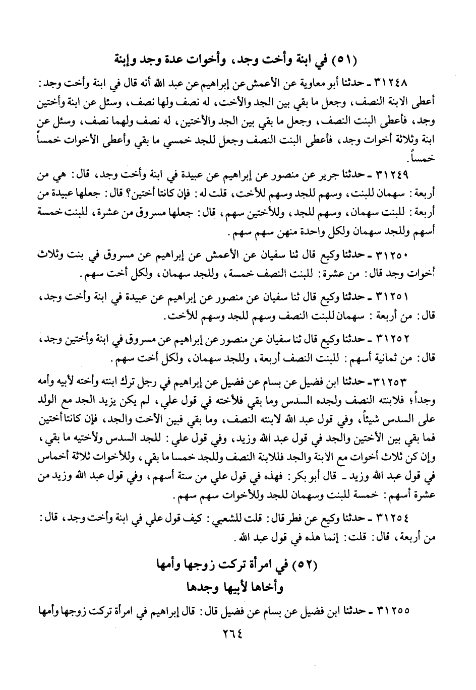 31251 - حَدَّثَنَا وَكِيعٌ، قَالَ: ثنا سُفْيَانُ، عَنْ مَنْصُورٍ، عَنْ إِبْرَاهِيمَ، عَنْ عُبَيْدَةَ، فِي ابْنَةٍ وَأُخْتٍ وَجَدٍّ، قَالَ: «§مِنْ أَرْبَعَةٍ سَهْمَانِ لِلْبِنْتِ , النِّصْفُ وَسَهْمٌ لِلْجَدِّ وَسَهْمٌ لِلْأُخْتِ»