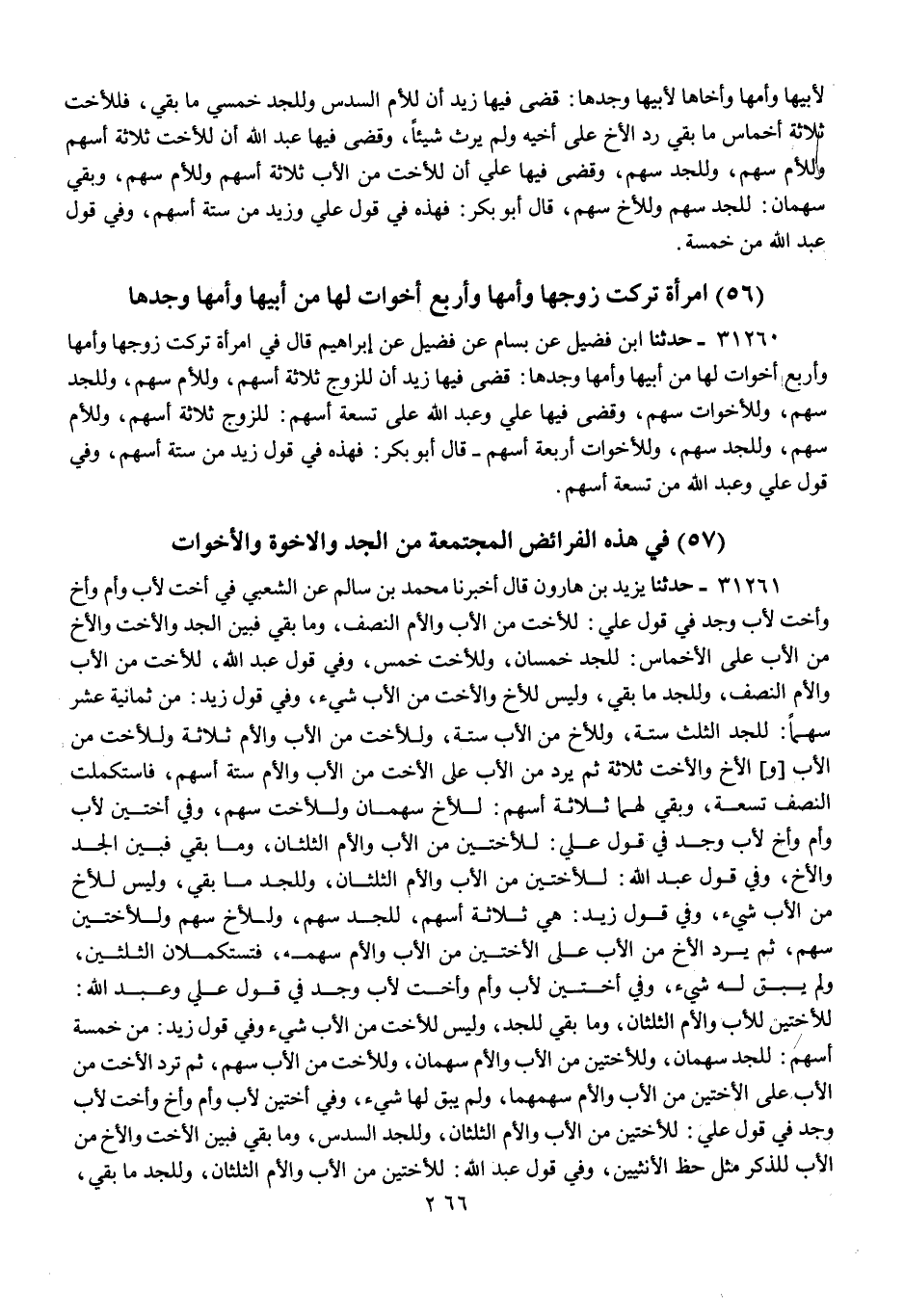 31261 - حَدَّثَنَا يَزِيدُ بْنُ هَارُونَ، قَالَ: أَخْبَرَنَا مُحَمَّدُ بْنُ سَالِمٍ، عَنِ الشَّعْبِيِّ، فِي أُخْتٍ لِأَبٍ، وَأَمٍّ وَأَخٍ، وَأُخْتٍ لِأَبٍ، وَجَدٍّ فِي قَوْلِ عَلِيٍّ: «§لِلْأُخْتِ مِنَ الْأَبِ، وَالْأُمِّ النِّصْفُ، وَمَا بَقِيَ فَبَيْنَ الْجَدِّ، وَالْأُخْتِ وَالْأَخِ مِنَ الْأَبِ عَلَى الْأَخْمَاسِ، لِلْجَدِّ خُمُسَانِ، وَلِلْأُخْتِ خُمُسٌ»، وَفِي قَوْلِ عَبْدِ اللَّهِ: «لِلْأُخْتِ مِنَ الْأَبِ وَالْأُمِّ النِّصْفُ، وَلِلْجَدِّ مَا بَقِيَ، وَلَيْسَ لِلْأَخِ وَالْأُخْتِ مِنَ الْأَبِ شَيْءٌ»، وَفِي قَوْلِ زَيْدٍ: «مِنْ ثَمَانِيَةَ عَشَرَ سَهْمًا، لِلْجَدِّ الثُّلُثُ سِتَّةٌ، وَلِلْأَخِ مِنَ الْأَبِ سِتَّةٌ، وَلِلْأُخْتِ مِنَ الْأَبِ وَالْأُمِّ ثَلَاثَةٌ وَلِلْأُخْتِ مِنَ الْأَبِ الْأَخُ وَالْأُخْتُ ثَلَاثَةٌ، ثُمَّ يَرُدُّ مِنَ الْأَبِ عَلَى الْأُخْتِ مِنَ الْأَبِ، وَالْأُمِّ سِتَّةَ أَسْهُمٍ، فَاسْتَكْمَلَتِ النِّصْفَ تِسْعَةً، وَبَقِيَ لَهُمَا ثَلَاثَةُ أَسْهُمٍ لِلْأَخِ سَهْمَانِ وَلِلْأُخْتِ سَهْمٌ، وَفِي أُخْتَيْنِ لِأَبٍ وَأَمٍّ وَأَخٍ لِأَبٍ وَجَدٍّ» فِي قَوْلِ عَلِيٍّ: «لِلْأُخْتَيْنِ مِنَ الْأَبِ وَالْأُمِّ الثُّلُثَانِ، وَمَا بَقِيَ فَبَيْنَ الْجَدِّ وَالْأَخِ»، وَفِي قَوْلِ عَبْدِ اللَّهِ: «لِلْأُخْتَيْنِ مِنَ الْأَبِ وَالْأُمِّ الثُّلُثَانِ، وَلِلْجَدِّ مَا بَقِيَ، وَلَيْسَ لِلْأَخِ مِنَ الْأَبِ شَيْءٌ»، وَفِي قَوْلِ زَيْدٍ: «هِيَ ثَلَاثَةُ أَسْهُمٍ لِلْجَدِّ سَهْمٌ، وَلِلْأَخِ سَهْمٌ وَلِلْأُخْتَيْنِ سَهْمٌ، ثُمَّ يَرُدُّ الْأَخُ مِنَ الْأَبِ عَلَى الْأُخْتَيْنِ مِنَ الْأَبِ وَالْأُمِّ سَهْمَهُ، فَتَسْتَكْمِلَانِ الثُّلُثَيْنِ، وَلَمْ يَبْقَ لَهُ شَيْءٌ»، «وَفِي أُخْتَيْنِ لِأَبٍ وَأَمٍّ وَأُخْتٍ لِأَبٍ وَجَدٍّ» فِي قَوْلِ عَلِيٍّ وَعَبْدِ اللَّهِ: «لِلْأُخْتَيْنِ لِلْأَبِ وَالْأُمِّ الثُّلُثَانِ، وَمَا بَقِيَ لِلْجَدِّ، وَلَيْسَ لِلْأُخْتِ مِنَ الْأَبِ شَيْءٌ» وَفِي قَوْلِ زَيْدٍ: «مِنْ خَمْسَةِ أَسْهُمٍ لِلْجَدِّ سَهْمَانِ، وَلِلْأُخْتَيْنِ مِنَ الْأَبِ وَالْأُمِّ سَهْمَانِ، وَلِلْأُخْتِ مِنَ الْأَبِ سَهْمٌ، ثُمَّ تَرُدُّ الْأُخْتُ مِنَ الْأَبِ عَلَى الْأُخْتَيْنِ مِنَ الْأَبِ وَالْأُمِّ سَهْمَهُمَا، وَلَمْ يَبْقَ لَهَا شَيْءٌ». وَفِي أُخْتَيْنِ لِأَبٍ وَأَمٍّ وَأَخٍ وَأُخْتٍ لِأَبٍ وَجَدٍّ فِي قَوْلِ عَلِيٍّ: لِلْأُخْتَيْنِ مِنَ الْأَبِ وَالْأُمِّ الثُّلُثَانِ، وَلِلْجَدِّ السُّدُسُ، وَمَا بَقِيَ فَبَيْنَ الْأُخْتِ وَالْأَخِ مِنَ الْأَبِ لِلذَّكَرِ مِثْلُ حَظِّ الْأُنْثَيَيْنِ " وَفِي قَوْلِ عَبْدِ اللَّهِ: «لِلْأُخْتَيْنِ مِنَ الْأَبِ وَالْأُمِّ الثُّلُثَانِ، وَلِلْجَدِّ مَا بَقِيَ -[267]-، وَلَيْسَ لِلْأَخِ وَالْأُخْتِ مِنَ الْأَبِ شَيْءٌ» وَفِي قَوْلِ زَيْدٍ: «مِنْ خَمْسَةَ عَشَرَ سَهْمًا لِلْجَدِّ الثُّلُثُ خَمْسَةُ أَسْهُمٍ، وَلِلْأَخِ مِنَ الْأَبِ أَرْبَعَةٌ، وَلِلْأُخْتِ مِنَ الْأَبِ سَهْمَانِ، وَلِلْأُخْتَيْنِ مِنَ الْأَبِ وَالْأُمِّ أَرْبَعَةٌ، ثُمَّ يَرُدُّ الْأَخُ وَالْأُخْتُ مِنَ الْأَبِ عَلَى الْأُخْتَيْنِ مِنَ الْأَبِ نَصِيبَهُمَا، تَسْتَكْمِلَانِ الثُّلُثَ وَلَمْ يَبْقَ لَهُمَا شَيْءٌ» وَفِي أُخْتَيْنِ لِأَبٍ وَأَمٍّ وَأُخْتَيْنِ لِأَبٍ وَجَدٍّ فِي قَوْلِ عَلِيٍّ وَعَبْدِ اللَّهِ: «لِلْأُخْتَيْنِ مِنَ الْأَبِ وَالْأُمِّ الثُّلُثَانِ، وَلِلْجَدِّ مَا بَقِيَ، وَلَيْسَ لِلْأُخْتَيْنِ مِنَ الْأَبِ شَيْءٌ»، وَفِي قَوْلِ زَيْدٍ: «مِنْ سِتَّةِ أَسْهُمٍ لِلْجَدِّ سَهْمَانِ، وَلِلْأُخْتَيْنِ مِنَ الْأَبِ وَالْأُمِّ سَهْمَانِ، وَلِلْأُخْتَيْنِ مِنَ الْأَبِ سَهْمَانِ، ثُمَّ تَرُدُّ الْأُخْتَانِ مِنَ الْ