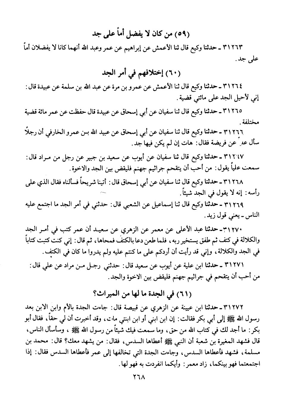 31263 - حَدَّثَنَا وَكِيعٌ، قَالَ: ثنا الْأَعْمَشُ، عَنْ إِبْرَاهِيمَ، عَنْ عُمَرَ، وَعَبْدِ اللَّهِ، «أَنَّهُمَا كَانَا §لَا يُفَضِّلَانِ أُمًّا عَلَى جَدٍّ»