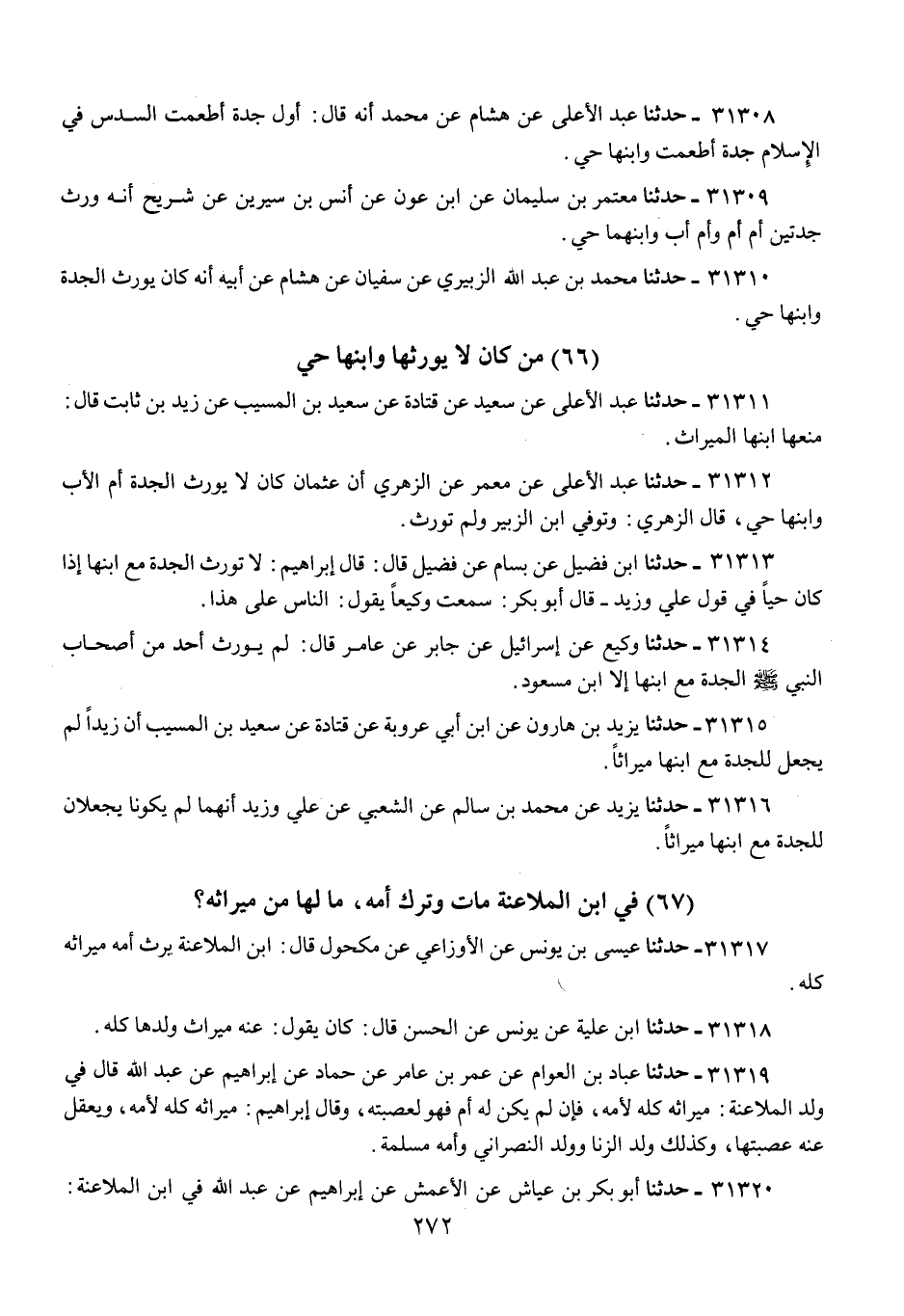 31315 - حَدَّثَنَا يَزِيدُ بْنُ هَارُونَ، عَنِ ابْنِ أَبِي عَرُوبَةَ، عَنْ قَتَادَةَ، عَنْ سَعِيدِ بْنِ الْمُسَيِّبِ، أَنَّ زَيْدًا، «§لَمْ يَجْعَلْ لِلْجَدَّةِ مَعَ ابْنِهَا مِيرَاثًا»