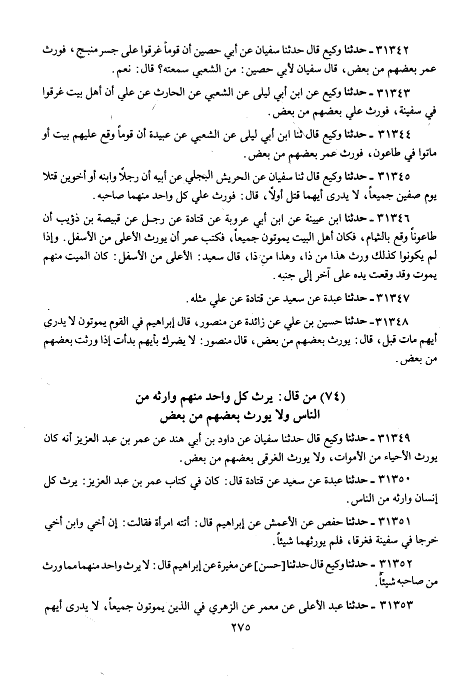 31349 - حَدَّثَنَا وَكِيعٌ، قَالَ: حَدَّثَنَا سُفْيَانُ، عَنْ دَاوُدَ بْنِ أَبِي هِنْدٍ، عَنْ عُمَرَ بْنِ عَبْدِ الْعَزِيزِ، «أَنَّهُ كَانَ §يُوَرِّثُ الْأَحْيَاءَ مِنَ الْأَمْوَاتِ، وَلَا يُوَرِّثُ الْغَرْقَى بَعْضَهُمْ مِنْ بَعْضٍ»