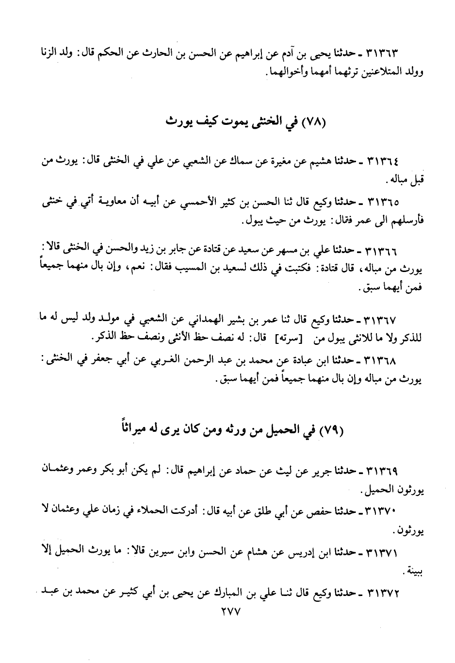 31367 - حَدَّثَنَا وَكِيعٌ، قَالَ ثنا عُمَرُ بْنُ بَشِيرٍ الْهَمْدَانِيُّ، عَنِ الشَّعْبِيِّ، فِي مَوْلُودٍ وُلِدَ لَيْسَ لَهُ مَا لِلذَّكَرِ وَلَا مَا لِلْأُنْثَى، يَبُولُ مِنْ سُرَّتِهِ، قَالَ: «§لَهُ نِصْفُ حَظِّ الْأُنْثَى وَنِصْفُ حَظِّ الذَّكَرِ»