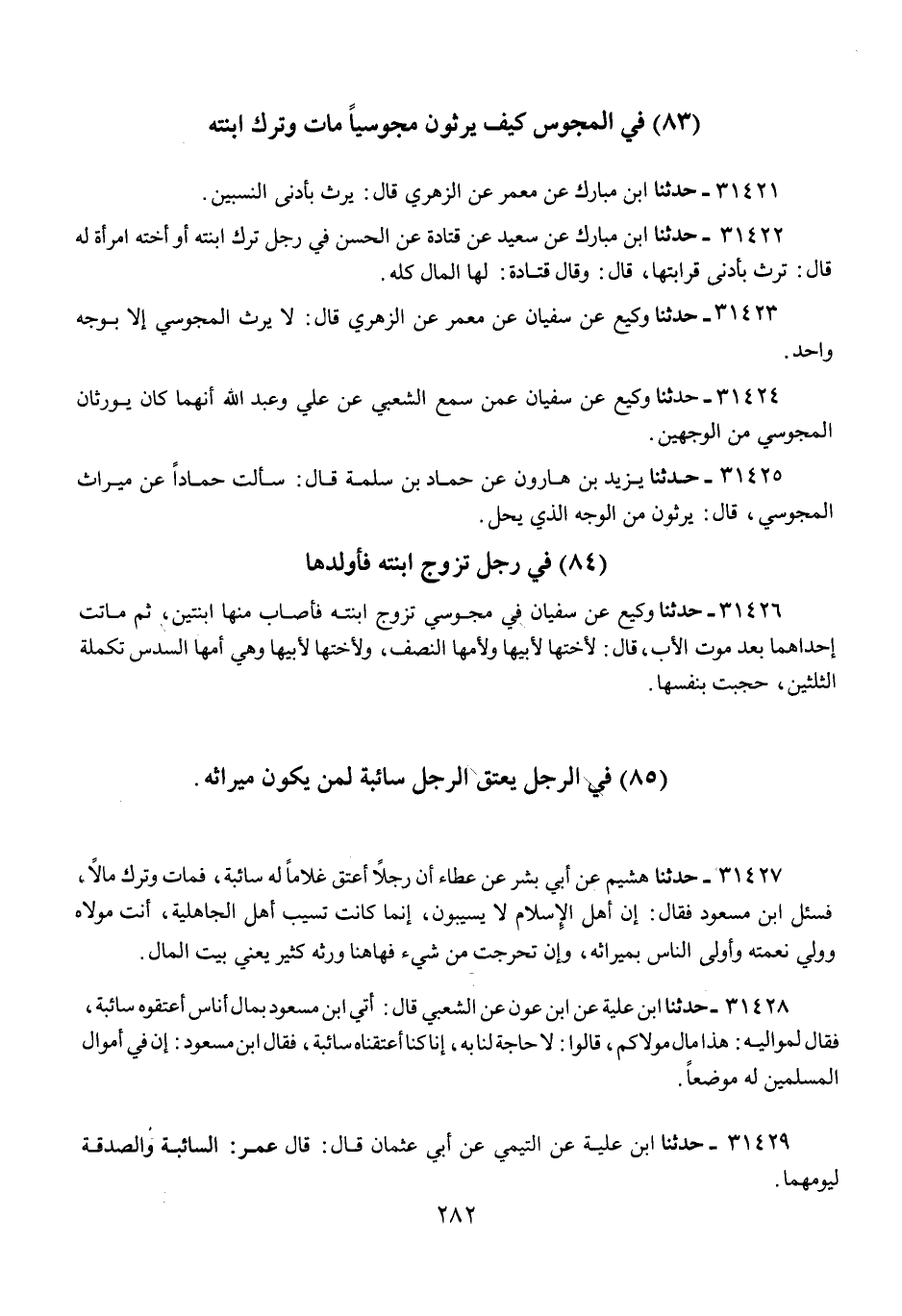 31423 - حَدَّثَنَا وَكِيعٌ، عَنْ سُفْيَانَ، عَنْ مَعْمَرٍ، عَنِ الزُّهْرِيِّ، قَالَ: «§لَا يَرِثُ الْمَجُوسِيُّ إِلَّا بِوَجْهٍ وَاحِدٍ»