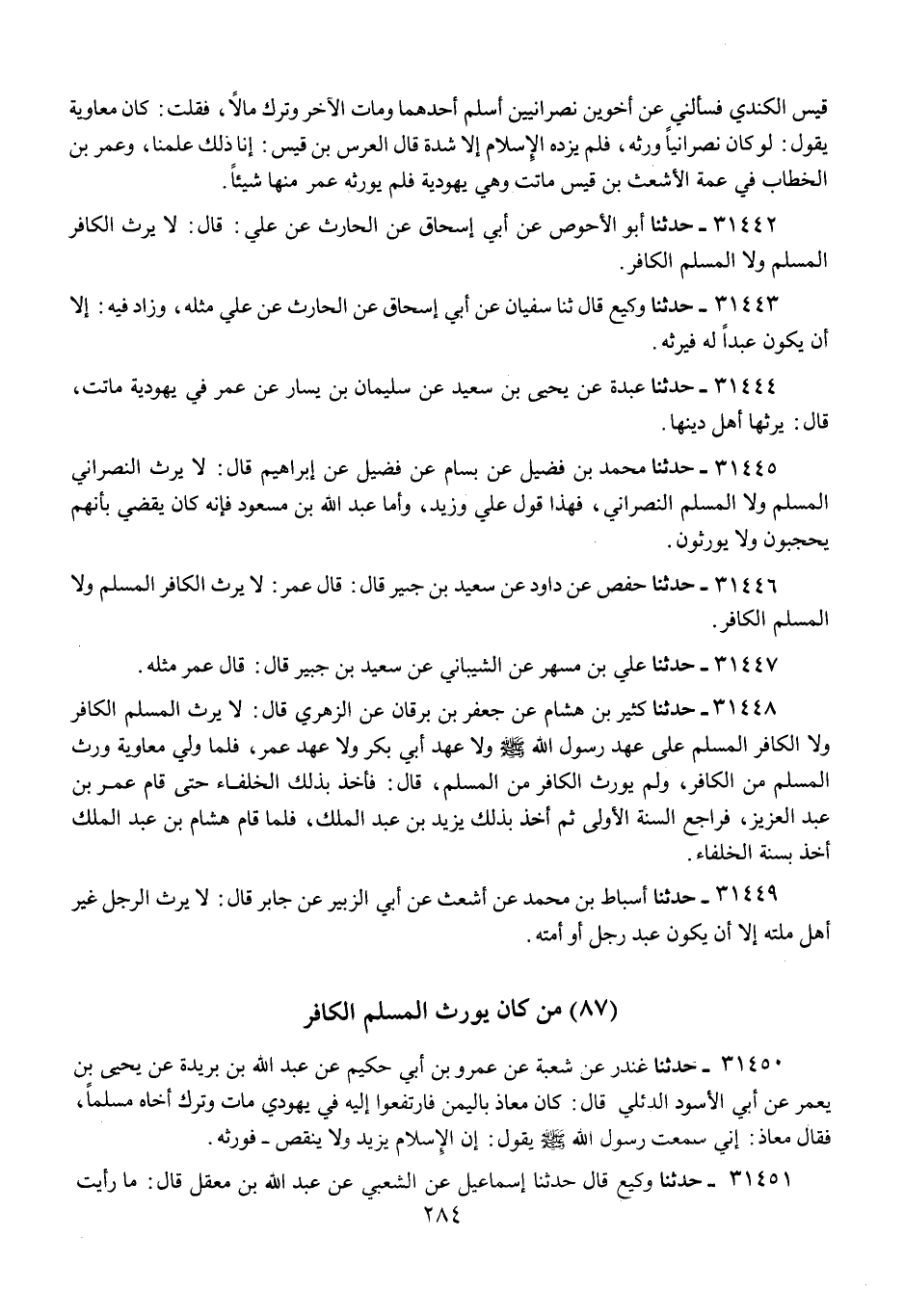 31448 - حَدَّثَنَا كَثِيرُ بْنُ هِشَامٍ، عَنْ جَعْفَرِ بْنِ بُرْقَانَ، عَنِ الزُّهْرِيِّ، قَالَ: «§لَا يَرِثُ الْمُسْلِمُ الْكَافِرَ، وَلَا الْكَافِرُ الْمُسْلِمَ عَلَى عَهْدِ رَسُولِ اللَّهِ صَلَّى اللهُ عَلَيْهِ وَسَلَّمَ، وَلَا عَهْدِ أَبِي بَكْرٍ، وَلَا عَهْدِ عُمَرَ، فَلَمَّا وُلِّيَ مُعَاوِيَةُ وَرَّثَ الْمُسْلِمَ مِنَ الْكَافِرِ وَلَمْ يُوَرِّثِ الْكَافِرَ مِنَ الْمُسْلِمِ»، قَالَ: فَأَخَذَ بِذَلِكَ الْخُلَفَاءُ حَتَّى قَامَ عُمَرُ بْنُ عَبْدِ الْعَزِيزِ، فَرَاجَعَ السُّنَّةَ الْأُولَى، ثُمَّ أَخَذَ بِذَلِكَ يَزِيدُ بْنُ عَبْدِ الْمَلِكِ، فَلَمَّا قَامَ هِشَامُ بْنُ عَبْدِ الْمَلِكِ أَخَذَ بِسُنَّةِ الْخُلَفَاءِ