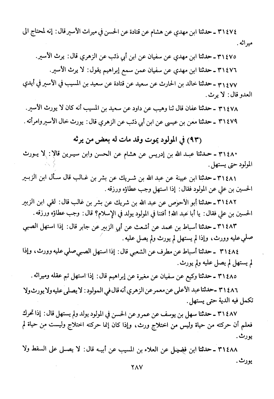 31475 - حَدَّثَنَا ابْنُ مَهْدِيٍّ، عَنْ سُفْيَانَ، عَنِ ابْنِ أَبِي ذِئْبٍ، عَنِ الزُّهْرِيِّ، قَالَ: «§يَرِثُ الْأَسِيرُ»