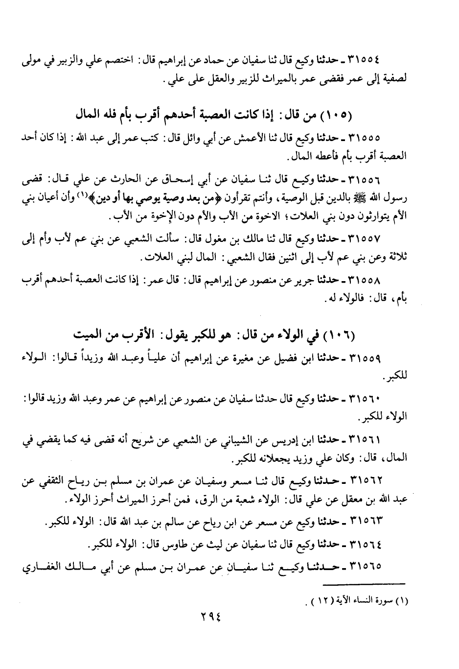 31560 - حَدَّثَنَا وَكِيعٌ، قَالَ: حَدَّثَنَا سُفْيَانُ، عَنْ مَنْصُورٍ، عَنْ إِبْرَاهِيمَ، عَنْ عُمَرَ، وَعَبْدِ اللَّهِ، وَزَيْدٍ، قَالُوا: «§الْوَلَاءُ لِلْكِبَرِ»