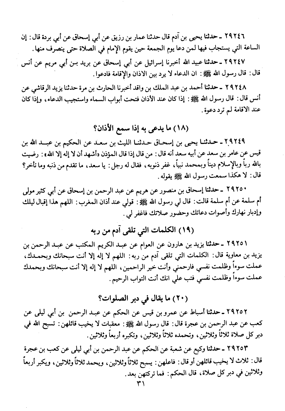 29254 - حَدَّثَنَا أَبُو الْأَحْوَصِ، عَنْ مَنْصُورٍ، عَنِ الْحَكَمِ، عَنْ عَبْدِ الرَّحْمَنِ بْنِ أَبِي لَيْلَى، عَنْ كَعْبٍ، قَالَ: «مُعَقِّبَاتٌ لَا يَخِيبُ قَائِلُهُنَّ»، ثُمَّ ذَكَرَ مِثْلَ حَدِيثِ وَكِيعٍ