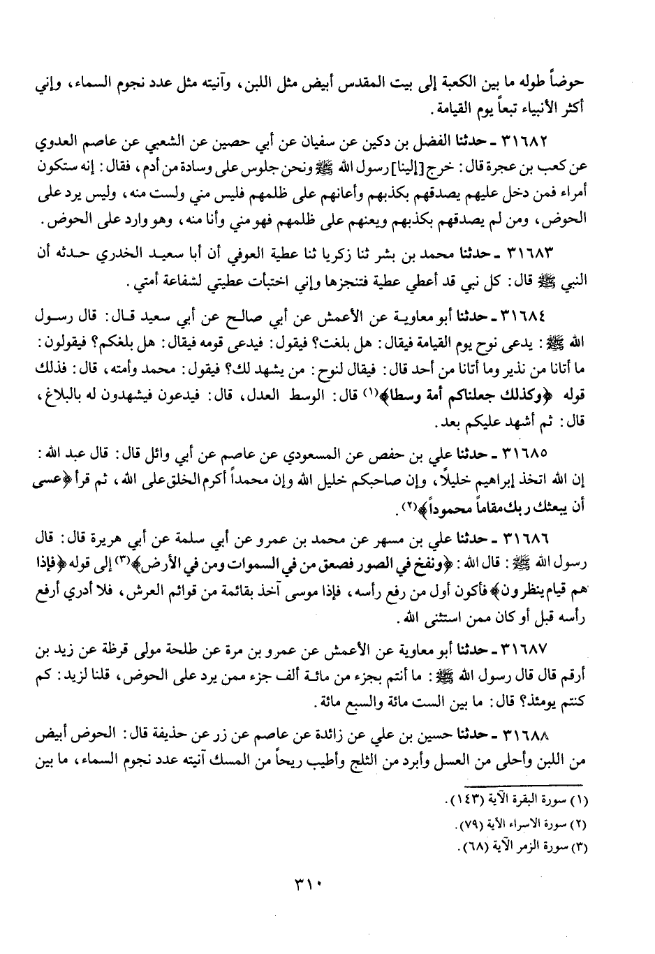 31687 - حَدَّثَنَا أَبُو مُعَاوِيَةَ عَنِ الْأَعْمَشِ عَنْ عَمْرِو بْنِ مُرَّةَ عَنْ طَلْحَةَ مَوْلَى قَرَظَةَ عَنْ زَيْدِ بْنِ أَرْقَمَ قَالَ: قَالَ رَسُولُ اللَّهِ صَلَّى اللهُ عَلَيْهِ وَسَلَّمَ: «§مَا أَنْتُمْ بِجُزْءٍ مِنْ مِائَةِ أَلْفِ جُزْءٍ مِمَّنْ يَرِدُ عَلَيَّ الْحَوْضَ» ; قُلْنَا لِزَيْدٍ: كَمْ كُنْتُمْ يَوْمَئِذٍ؟ قَالَ: مَا بَيْنَ السِّتِّ مِائَةٍ وَالسَّبْعِ مِائَةٍ