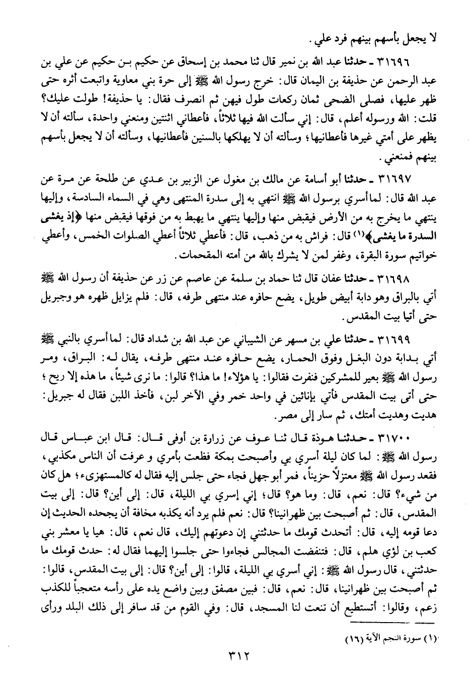 31697 - حَدَّثَنَا أَبُو أُسَامَةَ عَنْ مَالِكِ بْنِ مِغْوَلٍ عَنِ الزُّبَيْرِ بْنِ عَدِيٍّ عَنْ طَلْحَةَ عَنْ مُرَّةَ عَنْ عَبْدِ اللَّهِ قَالَ: " لَمَّا أُسْرِيَ بِرَسُولِ اللَّهِ صَلَّى اللهُ عَلَيْهِ وَسَلَّمَ انْتُهِيَ بِهِ إِلَى سِدْرَةِ الْمُنْتَهَى وَهِيَ فِي السَّمَاءِ السَّادِسَةِ , وَإِلَيْهَا يَنْتَهِي مَا يَخْرُجُ بِهِ مِنَ الْأَرْضِ فَيُقْبَضُ مِنْهَا وَإِلَيْهَا يَنْتَهِي مَا يَهْبِطُ بِهِ مِنْ فَوْقِهَا فَيُقْبَضُ مِنْهَا {إِذْ يَغْشَى السِّدْرَةَ مَا يَغْشَى} [النجم: 16] قَالَ: فَرَاشٌ بِهِ مِنْ ذَهَبٍ , قَالَ: فَأُعْطِيَ ثَلَاثًا: §أُعْطِيَ الصَّلَوَاتِ الْخَمْسَ , وَأُعْطِيَ خَوَاتِيمَ سُورَةِ الْبَقَرَةِ , وَغُفِرَ لِمَنْ لَا يُشْرِكُ بِاللَّهِ مِنْ أُمَّتِهِ الْمُقْحِمَاتُ "