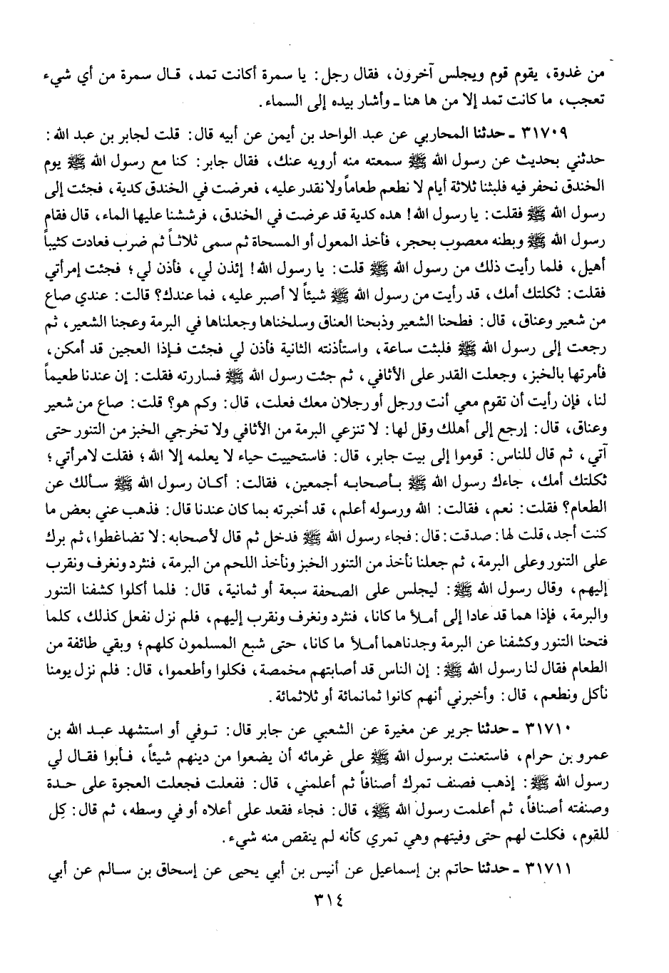 31709 - حَدَّثَنَا الْمُحَارِبِيُّ عَنْ عَبْدِ الْوَاحِدِ بْنِ أَيْمَنَ عَنْ أَبِيهِ قَالَ: قُلْتُ لِجَابِرِ بْنِ عَبْدِ اللَّهِ: حَدِّثْنِي بِحَدِيثٍ عَنْ رَسُولِ اللَّهِ صَلَّى اللهُ عَلَيْهِ وَسَلَّمَ سَمِعْتُهُ مِنْهُ أَرْوِيهِ عَنْكَ , فَقَالَ جَابِرٌ: كُنَّا مَعَ رَسُولِ اللَّهِ صَلَّى اللهُ عَلَيْهِ وَسَلَّمَ §يَوْمَ الْخَنْدَقِ نَحْفِرُ فِيهِ فَلَبِثْنَا ثَلَاثَةَ أَيَّامٍ لَا نَطْعَمُ طَعَامًا وَلَا نَقْدِرُ عَلَيْهِ , فَعَرَضَتْ فِي الْخَنْدَقِ كُدْيَةٌ , فَجِئْتُ إِلَى رَسُولِ اللَّهِ صَلَّى اللهُ عَلَيْهِ وَسَلَّمَ فَقُلْتُ: يَا رَسُولَ اللَّهِ , هَذِهِ كُدْيَةٌ قَدْ عَرَضَتْ فِي الْخَنْدَقِ , فَرَشَشْنَا عَلَيْهَا الْمَاءَ , قَالَ فَقَامَ رَسُولُ اللَّهِ صَلَّى اللهُ عَلَيْهِ وَسَلَّمَ وَبَطْنُهُ مَعْصُوبٌ بِحَجَرٍ , فَأَخَذَ الْمِعْوَلَ أَوِ الْمِسْحَاةَ ثُمَّ سَمَّى ثَلَاثًا ثُمَّ ضَرَبَ فَعَادَتْ كَثِيبًا أَهْيَلَ , فَلَمَّا رَأَيْتُ ذَلِكَ مِنْ رَسُولِ اللَّهِ صَلَّى اللهُ عَلَيْهِ وَسَلَّمَ قُلْتُ: يَا رَسُولَ اللَّهِ , ائْذَنْ لِي , فَأَذِنَ لِي ; فَجِئْتُ امْرَأَتِي فَقُلْتُ: ثَكِلَتْكَ أُمُّكَ , قَدْ رَأَيْتُ مِنْ رَسُولِ اللَّهِ صَلَّى اللهُ عَلَيْهِ وَسَلَّمَ شَيْئًا لَا أَصْبِرُ عَلَيْهِ , فَمَا عِنْدَكَ؟ قَالَتْ: عِنْدِي صَاعٌ مِنْ شَعِيرٍ وَعَنَاقٌ , قَالَ: فَطَحَنَّا الشَّعِيرَ وَذَبَحْنَا الْعَنَاقَ وَسَلَخْنَاهَا وَجَعَلْنَاهَا فِي الْبُرْمَةِ وَعَجَنَّا الشَّعِيرَ , ثُمَّ رَجَعْتُ إِلَى رَسُولِ اللَّهِ صَلَّى اللهُ عَلَيْهِ وَسَلَّمَ فَلَبِثْتُ سَاعَةً , وَاسْتَأْذَنْتُهُ الثَّانِيَةَ فَأَذِنَ لِي فَجِئْتُ فَإِذَا الْعَجِينُ قَدْ أَمْكَنَ , فَأَمَرْتُهَا بِالْخُبْزِ , وَجَعَلْتُ الْقِدْرَ عَلَى الْأَثَافِيِّ , ثُمَّ جِئْتُ رَسُولَ اللَّهِ صَلَّى اللهُ عَلَيْهِ وَسَلَّمَ فَسَارَرْتُهُ فَقُلْتُ: إِنَّ عِنْدَنَا طُعَيِّمًا لَنَا , فَإِنْ رَأَيْتُ أَنْ تَقُومَ مَعِي أَنْتَ وَرَجُلٌ أَوْ رَجُلَانِ مَعَكَ فَعَلْتُ , قَالَ: «وَكَمْ هُوَ؟» قُلْتُ: صَاعٌ مِنْ شَعِيرٍ وَعَنَاقٌ , قَالَ: " ارْجِعْ إِلَى أَهْلِكَ وَقُلْ لَهَا: لَا تَنْزِعِي الْبُرْمَةَ مِنَ الْأَثَافِيِّ وَلَا تُخْرِجِي الْخُبْزَ مِنَ التَّنُّورِ حَتَّى آتِيَ " , ثُمَّ قَالَ لِلنَّاسِ: «قُومُوا إِلَى بَيْتِ جَابِرٍ» , قَالَ: فَاسْتَحْيَيْتُ حَيَاءً لَا يَعْلَمُهُ إِلَّا اللَّهُ ; فَقُلْتُ لِامْرَأَتِي ; ثَكِلَتْكَ أُمُّكَ , جَاءَكَ رَسُولُ اللَّهِ صَلَّى اللهُ عَلَيْهِ وَسَلَّمَ بِأَصْحَابِهِ أَجْمَعِينَ , فَقَالَتْ: أَكَانَ رَسُولُ اللَّهِ صَلَّى اللهُ عَلَيْهِ وَسَلَّمَ سَأَلَكَ عَنِ الطَّعَامِ؟ فَقُلْتُ: نَعَمْ , فَقَالَتِ: اللَّهُ وَرَسُولُهُ أَعْلَمُ , قَدْ أَخْبَرْتُهُ بِمَا كَانَ عِنْدَنَا , قَالَ: فَذَهَبَ عَنِّي بَعْضُ مَا كُنْتُ أَجِدُ , قُلْتُ لَهَا: صَدَقْتُ: قَالَ: فَجَاءَ رَسُولُ اللَّهِ صَلَّى اللهُ عَلَيْهِ وَسَلَّمَ فَدَخَلَ ثُمَّ قَالَ لِأَصْحَابِهِ: لَا تَضَاغَطُوا , ثُمَّ بَرَكَ عَلَى التَّنُّورِ وَعَلَى الْبُرْمَةِ , ثُمَّ جَعَلْنَا نَأْخُذُ مِنَ التَّنُّورِ الْخُبْزَ وَنَأْخُذُ اللَّحْمَ مِنَ الْبُرْمَةِ , فَنَثْرُدُ وَنَغْرِفُ وَنُقَرِّبُ إِلَيْهِمْ , وَقَالَ رَسُولُ اللَّهِ صَلَّى اللهُ عَلَيْهِ وَسَلَّمَ: «لِيَجْلِسْ عَلَى الصَّحْفَةِ سَبْعَةٌ أَوْ ثَمَانِيَةٌ» , قَالَ: فَلَمَّا أَكَلُوا كَشَفْنَا التَّنُّورَ وَالْبُرْمَةَ , فَإِذَا هُمَا قَدْ عَادَا إِلَى أَمْلَأِ مَا كَانَا , فَنَثْرُدُ وَنَغْرِفُ وَنُقَرِّبُ إِلَيْهِمْ , فَلَمْ نَزَلْ نَفْعَلُ كَذَلِكَ , كُلَّمَا فَتَحْنَا التَّنُّورَ وَكَشَفْنَا عَنِ الْبُرْمَةِ وَجَدْنَاهُمَا أَمْلَأَ مَا كَانَا , حَتَّى شَبِعَ الْمُسْلِمُو