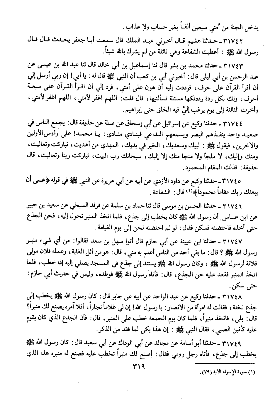 31745 - حَدَّثَنَا وَكِيعٌ عَنْ دَاوُدَ الْأَزْدِيِّ عَنْ أَبِيهِ عَنْ أَبِي هُرَيْرَةَ عَنِ النَّبِيِّ صَلَّى اللهُ عَلَيْهِ وَسَلَّمَ فِي قَوْلِهِ: {§عَسَى أَنْ يَبْعَثَكَ رَبُّكَ مَقَامًا مَحْمُودًا} [الإسراء: 79] قَالَ: «الشَّفَاعَةُ»