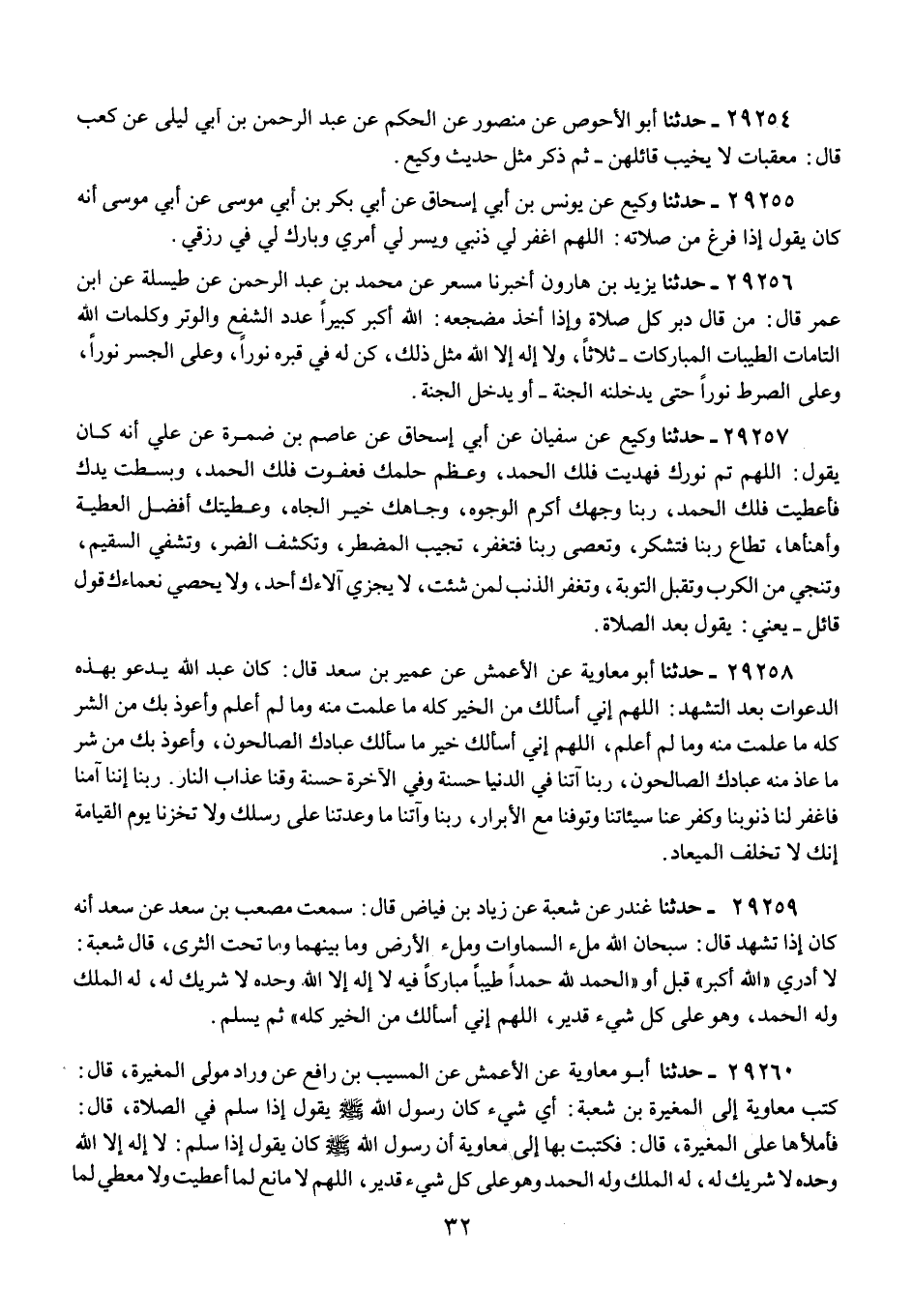 29260 - حَدَّثَنَا أَبُو مُعَاوِيَةَ، عَنِ الْأَعْمَشِ، عَنِ الْمُسَيِّبِ بْنِ رَافِعٍ، عَنْ ورَّادٍ، مَوْلَى الْمُغِيرَةِ، قَالَ: كَتَبَ مُعَاوِيَةُ إِلَى الْمُغِيرَةِ بْنِ شُعْبَةَ: أَيُّ شَيْءٍ كَانَ رَسُولُ اللَّهِ صَلَّى اللهُ عَلَيْهِ وَسَلَّمَ يَقُولُ إِذَا سَلَّمَ فِي الصَّلَاةِ؟، قَالَ: فَأَمْلَاهَا عَلَيَّ الْمُغِيرَةُ، قَالَ: فَكَتَبْتُ بِهَا إِلَى مُعَاوِيَةَ، أَنَّ رَسُولَ اللَّهِ صَلَّى اللهُ عَلَيْهِ وَسَلَّمَ كَانَ §يَقُولُ إِذَا سَلَّمَ: «لَا إِلَهَ إِلَّا اللَّهُ وَحْدَهُ لَا شَرِيكَ لَهُ، لَهُ الْمُلْكُ وَلَهُ الْحَمْدُ وَهُوَ عَلَى كُلِّ شَيْءٍ قَدِيرٌ، اللَّهُمَّ لَا مَانِعَ لِمَا أَعْطَيْتَ، وَلَا مُعْطِيَ لِمَا مَنَعْتَ، وَلَا يَنْفَعُ ذَا الْجَدِّ مِنْكَ الْجَدُّ»