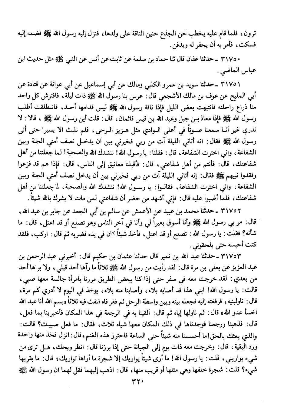 31753 - حَدَّثَنَا عَبْدُ اللَّهِ بْنُ نُمَيْرٍ قَالَ: حَدَّثَنَا عُثْمَانُ بْنُ حَكِيمٍ قَالَ: أَخْبَرَنِي عَبْدُ الرَّحْمَنِ بْنُ عَبْدِ الْعَزِيزِ , عَنْ يَعْلَى بْنِ مُرَّةَ قَالَ: لَقَدْ §رَأَيْتُ مِنْ رَسُولِ اللَّهِ صَلَّى اللهُ عَلَيْهِ وَسَلَّمَ ثَلَاثًا مَا رَآهَا أَحَدٌ قَبْلِي , وَلَا يَرَاهَا أَحَدٌ مِنْ بَعْدِي: لَقَدْ خَرَجْتُ مَعَهُ فِي سَفَرٍ حَتَّى إِذَا كُنَّا بِبَعْضِ الطَّرِيقِ مَرَرْنَا بِامْرَأَةٍ جَالِسَةٍ مَعَهَا صَبِيٌّ , قَالَتْ: يَا رَسُولَ اللَّهِ , ابْنِي هَذَا قَدْ أَصَابَهُ بَلَاءٌ , وَأَصَابَنَا مِنْهُ بَلَاءٌ , يُؤْخَذُ فِي الْيَوْمِ لَا أَدْرِي كَمْ مَرَّةً , قَالَ: «نَاوِلِينِيهِ» , فَرَفَعَتْهُ إِلَيْهِ فَجَعَلَهُ بَيْنَهُ وَبَيْنَ وَاسِطَةِ الرَّحْلِ ثُمَّ فَغَرَ فَاهُ فَنَفَثَ فِيهِ ثَلَاثًا «بِسْمِ اللَّهِ، أَنَا عَبْدُ اللَّهِ، اخْسَأْ عَدُوَّ اللَّهِ» قَالَ: ثُمَّ نَاوَلَهَا إِيَّاهُ ثُمَّ قَالَ: «الْقَيْنَا بِهِ فِي الرَّجْعَةِ فِي هَذَا الْمَكَانِ فَأَخْبِرِينَا بِمَا فَعَلَ» , قَالَ: فَذَهَبْنَا وَرَجَعْنَا فَوَجَدْنَاهَا فِي ذَلِكَ الْمَكَانِ مَعَهَا شِيَاهٌ ثَلَاثٌ , فَقَالَ: «مَا فَعَلَ صَبِيُّكَ؟» قَالَتْ: وَالَّذِي بَعَثَكَ بِالْحَقِّ , مَا أَحْسَسْنَا مِنْهُ شَيْئًا حَتَّى السَّاعَةِ فَاحْتَرِزْ هَذِهِ الْغَنَمَ , قَالَ: «انْزِلْ فَخُذْ مِنْهَا وَاحِدَةً وَرُدَّ الْبَقِيَّةَ» , قَالَ: وَخَرَجْتُ مَعَهُ ذَاتَ يَوْمٍ إِلَى الْجَبَّانَةِ حَتَّى إِذَا بَرَزْنَا قَالَ: «انْظُرْ وَيْحَكَ , هَلْ تَرَى مِنْ شَيْءٍ يُوَارِينِي» , قُلْتُ: يَا رَسُولَ اللَّهِ , مَا أَرَى شَيْئًا يُوَارِيكَ إِلَّا شَجَرَةً مَا أَرَاهَا تُوَارِيكَ ; قَالَ: «مَا يَقْرُبُهَا شَيْءٌ؟» قُلْتُ: شَجَرَةٌ خَلْفَهَا وَهِيَ مِثْلُهَا أَوْ قَرِيبٌ مِنْهَا , قَالَ: «اذْهَبْ إِلَيْهِمَا فَقُلْ لَهُمَا إِنَّ رَسُولَ اللَّهِ صَلَّى اللهُ عَلَيْهِ وَسَلَّمَ -[321]- يَأْمُرُكُمَا أَنْ تَجْتَمِعَا بِإِذْنِ اللَّهِ» , قَالَ: فَاجْتَمَعَتَا فَبَرَزَ لِحَاجَتِهِ ثُمَّ رَجَعَ فَقَالَ: «اذْهَبْ إِلَيْهِمَا , فَقُلْ لَهُمَا إِنَّ رَسُولَ اللَّهِ صَلَّى اللهُ عَلَيْهِ وَسَلَّمَ يَأْمُرُكُمَا أَنْ تَرْجِعَ كُلُّ وَاحِدَةٍ مِنْكُمَا إِلَى مَكَانِهَا» , قَالَ: وَكُنْتُ جَالِسًا مَعَهُ ذَاتَ يَوْمٍ إِذْ جَاءَ جَمَلٌ يُخَبِّبُ حَتَّى صَوَّبَ بِجِرَانِهِ بَيْنَ يَدَيْهِ ثُمَّ ذَرَفَتْ عَيْنَاهُ فَقَالَ: «انْظُرْ وَيْحَكَ لِمَنْ هَذَا الْجَمَلُ؟ إِنَّ لَهُ لَشَأْنًا» , فَخَرَجْتُ أَلْتَمِسُ صَاحِبَهُ فَوَجَدْتُهُ لِرَجُلٍ مِنَ الْأَنْصَارِ فَدَعَوْتُهُ إِلَيْهِ فَقَالَ: مَا شَأْنُ جَمَلِكَ هَذَا؟ قَالَ: وَمَا شَأْنُهُ؟ قَالَ: لَا أَدْرِي وَاللَّهِ مَا شَأْنُهُ ; عَمِلْنَا عَلَيْهِ وَنَضَحْنَا عَلَيْهِ حَتَّى عَجَزَ عَنِ السِّقَايَةِ , فَائْتَمَرْنَا الْبَارِحَةَ أَنْ نَنْحَرَهُ وَنُقَسِّمَ لَحْمَهُ , قَالَ: «فَلَا تَفْعَلْ , هَبْهُ لِي أَوْ بِعْنِيهِ» , قَالَ: بَلْ هُوَ لَكَ يَا رَسُولَ اللَّهِ , فَوَسَمَهُ بِسِمَةِ الصَّدَقَةِ ثُمَّ بَعَثَ بِهِ