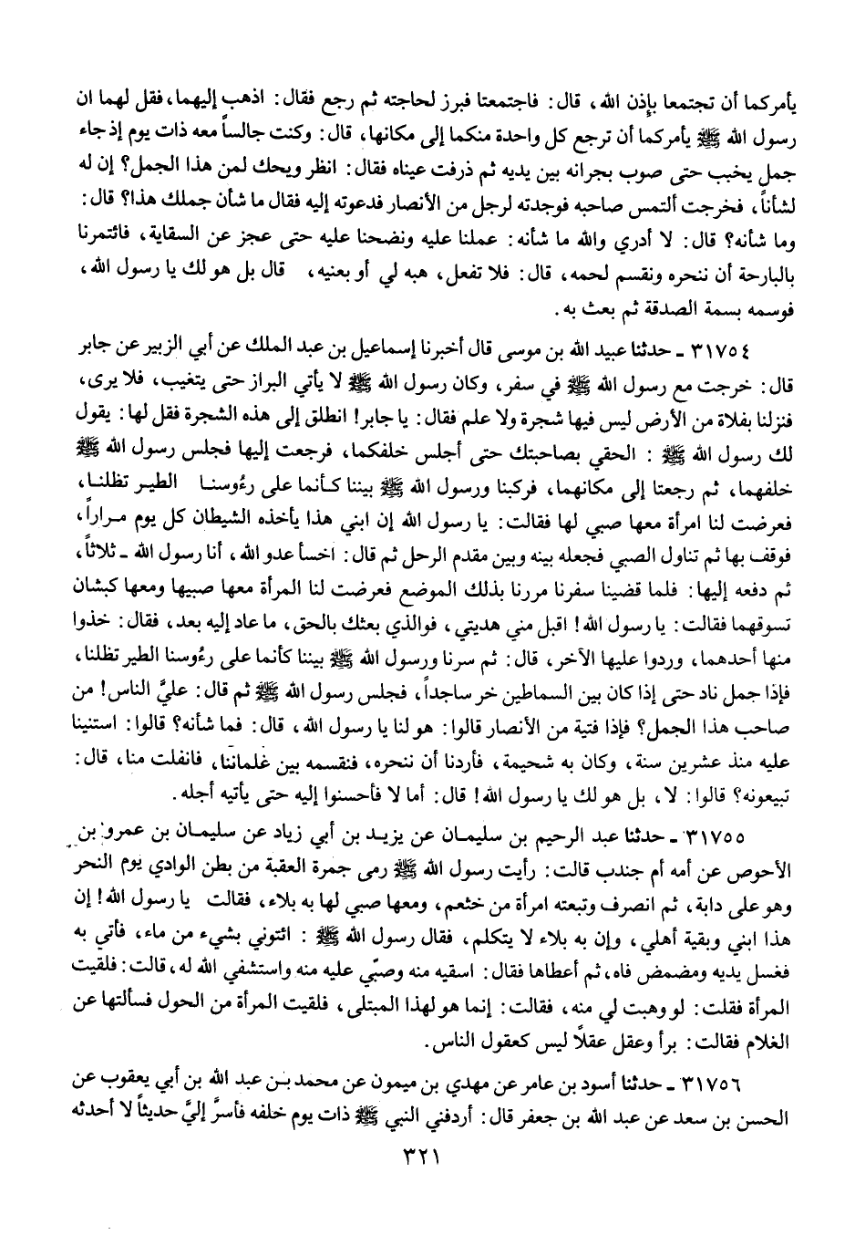 31754 - حَدَّثَنَا عُبَيْدُ اللَّهِ بْنُ مُوسَى قَالَ: أَخْبَرَنَا إِسْمَاعِيلُ بْنُ عَبْدِ الْمَلِكِ عَنْ أَبِي الزُّبَيْرِ عَنْ جَابِرٍ قَالَ: خَرَجْتُ مَعَ رَسُولِ اللَّهِ صَلَّى اللهُ عَلَيْهِ وَسَلَّمَ فِي سَفَرٍ , وَكَانَ رَسُولُ اللَّهِ صَلَّى اللهُ عَلَيْهِ وَسَلَّمَ لَا يَأْتِي الْبَرَازَ حَتَّى يَتَغَيَّبَ , فَلَا يُرَى , فَنَزَلْنَا بِفَلَاةٍ مِنَ الْأَرْضِ لَيْسَ فِيهَا شَجَرَةٌ وَلَا عَلَمٌ فَقَالَ: " يَا جَابِرُ , §انْطَلِقْ إِلَى هَذِهِ الشَّجَرَةِ فَقُلْ لَهَا: يَقُولُ لَكَ رَسُولُ اللَّهِ صَلَّى اللهُ عَلَيْهِ وَسَلَّمَ: الْحَقِي بِصَاحِبَتِكَ حَتَّى أَجْلِسَ خَلْفَكُمَا " فَرَجَعَتُ إِلَيْهَا فَجَلَسَ رَسُولُ اللَّهِ صَلَّى اللهُ عَلَيْهِ وَسَلَّمَ خَلْفَهُمَا , ثُمَّ رَجَعَتَا إِلَى مَكَانِهِمَا , فَرَكِبْنَا وَرَسُولُ اللَّهِ صَلَّى اللهُ عَلَيْهِ وَسَلَّمَ بَيْنَنَا كَأَنَّمَا عَلَى رُءُوسِنَا الطَّيْرُ تُظِلُّنَا , فَعَرَضَتْ لَنَا امْرَأَةٌ مَعَهَا صَبِيٌّ لَهَا فَقَالَتْ: يَا رَسُولَ اللَّهِ إِنَّ ابْنِي هَذَا يَأْخُذُهُ الشَّيْطَانُ كُلَّ يَوْمٍ مِرَارًا , فَوَقَفَ بِهَا ثُمَّ تَنَاوَلَ الصَّبِيَّ فَجَعَلَهُ بَيْنَهُ وَبَيْنَ مُقَدَّمِ الرَّحْلِ ثُمَّ قَالَ: «اخْسَأْ عَدُوَّ اللَّهِ , أَنَا رَسُولُ اللَّهِ» ثَلَاثًا , ثُمَّ دَفَعَهُ إِلَيْهَا ; فَلَمَّا قَضَيْنَا سَفَرَنَا مَرَرْنَا بِذَلِكَ الْمَوْضِعِ فَعَرَضَتْ لَنَا الْمَرْأَةُ مَعَهَا صَبِيُّهَا وَمَعَهَا كَبْشَانِ تَسُوقُهُمَا , فَقَالَتْ: يَا رَسُولَ اللَّهِ , اقْبَلْ مِنِّي هَدِيَّتِي , فَوَالَّذِي بَعَثَكَ بِالْحَقِّ , مَا عَادَ إِلَيْهِ بَعْدُ , فَقَالَ: «خُذُوا مِنْهَا أَحَدَهُمَا , وَرُدُّوا عَلَيْهَا الْآخَرَ» , قَالَ: ثُمَّ سِرْنَا وَرَسُولُ اللَّهِ صَلَّى اللهُ عَلَيْهِ وَسَلَّمَ بَيْنَنَا كَأَنَّمَا عَلَى رُءُوسِنَا الطَّيْرُ تُظِلُّنَا , فَإِذَا جَمَلٌ نَادٌّ حَتَّى إِذَا كَانَ بَيْنَ السِّمَاطَيْنِ خَرَّ سَاجِدًا , فَجَلَسَ رَسُولُ اللَّهِ صَلَّى اللهُ عَلَيْهِ وَسَلَّمَ ثُمَّ قَالَ: «عَلَيَّ النَّاسَ , مَنْ صَاحِبُ هَذَا الْجَمَلِ؟» فَإِذَا فِتْيَةٌ مِنَ الْأَنْصَارِ , قَالُوا: هُوَ لَنَا يَا رَسُولَ اللَّهِ , قَالَ: «فَمَا شَأْنُهُ؟» قَالُوا: اسْتَنَيْنَا عَلَيْهِ مُنْذُ عِشْرِينَ سَنَةً , وَكَانَتْ بِهِ شُحَيْمَةٌ , فَأَرَدْنَا أَنْ نَنْحَرَهُ , فَنَقْسِمُهُ بَيْنَ غِلْمَانِنَا , فَانْفَلَتَ مِنَّا , قَالَ: «تَبِيعُونَهُ؟» قَالُوا: لَا , بَلْ هُوَ لَكَ يَا رَسُولَ اللَّهِ , قَالَ: «أَمَا لَا فَأَحْسِنُوا إِلَيْهِ حَتَّى يَأْتِيَهُ أَجَلُهُ»