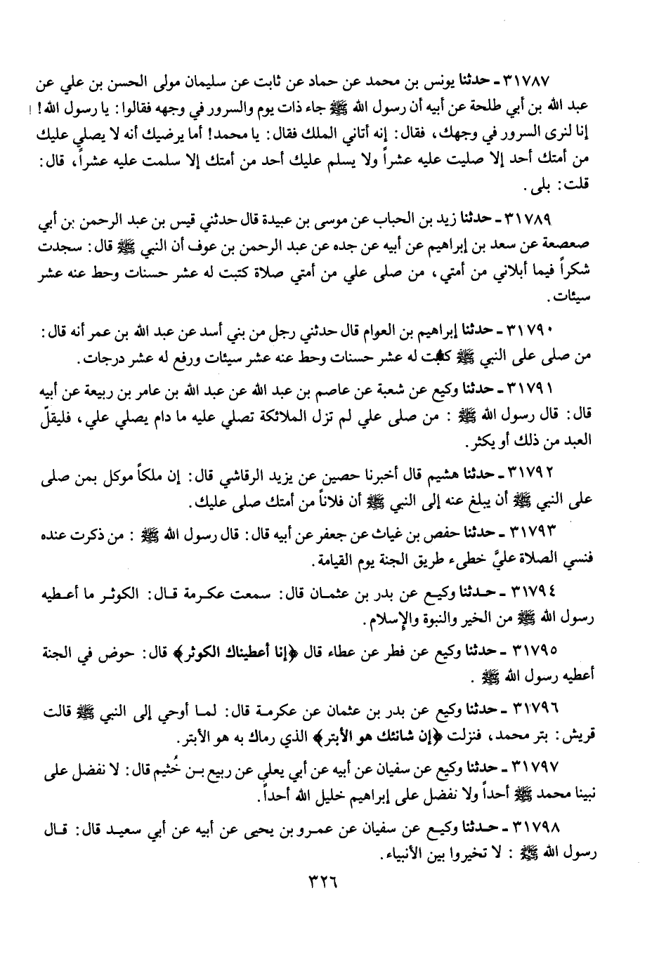 31797 - حَدَّثَنَا وَكِيعٌ عَنْ سُفْيَانَ عَنْ أَبِيهِ عَنْ أَبِي يَعْلَى عَنْ رَبِيعِ بْنِ خَيْثَمٍ قَالَ: «§لَا نُفَضِّلُ عَلَى نَبِيِّنَا مُحَمَّدٍ صَلَّى اللهُ عَلَيْهِ وَسَلَّمَ أَحَدًا وَلَا نُفَضِّلُ عَلَى إِبْرَاهِيمَ خَلِيلِ اللَّهِ أَحَدًا»