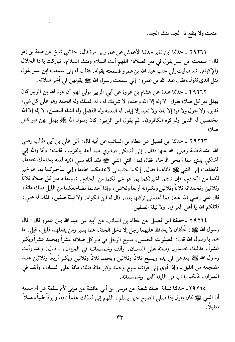 29261 - حَدَّثَنَا ابْنُ نُمَيْرٍ، حَدَّثَنَا الْأَعْمَشُ، عَنْ عَمْرِو بْنِ مُرَّةَ، قَالَ: حَدَّثَنِي شَيْخٌ، عَنْ صِلَةَ بْنِ زُفَرَ، قَالَ: سَمِعْتُ ابْنَ عُمَرَ، §يَقُولُ فِي دُبُرِ الصَّلَاةِ: «اللَّهُمَّ أَنْتَ السَّلَامُ وَمِنْكَ السَّلَامُ، تَبَارَكْتَ يَا ذَا الْجَلَالِ وَالْإِكْرَامِ»، ثُمَّ صَلَّيْتُ إِلَى جَنْبِ عَبْدِ اللَّهِ بْنِ عَمْرٍو فَسَمِعْتُهُ يَقُولُهُ، فَقُلْتُ لَهُ: إِنِّي سَمِعْتُ ابْنَ عُمَرَ يَقُولُ مِثْلَ الَّذِي تَقُولُ، فَقَالَ عَبْدُ اللَّهِ بْنُ عَمْرٍو: إِنِّي سَمِعْتُ رَسُولَ اللَّهِ صَلَّى اللهُ عَلَيْهِ وَسَلَّمَ يَقُولُهُنَّ فِي آخِرِ صَلَاتِهِ