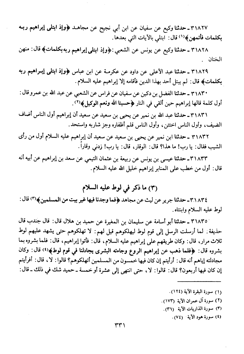 31835 - حَدَّثَنَا أَبُو أُسَامَةَ، عَنْ سُلَيْمَانَ بْنِ الْمُغِيرَةِ، عَنْ حُمَيْدِ بْنِ هِلَالٍ، قَالَ: قَالَ جُنْدُبٌ: قَالَ حُذَيْفَةُ: " §لَمَّا أُرْسِلَتِ الرُّسُلُ إِلَى قَوْمِ لُوطٍ لِيُهْلِكُوهُمْ قِيلَ لَهُمْ: لَا تُهْلِكُوهُمْ حَتَّى يَشْهَدَ عَلَيْهِمْ لُوطٌ ثَلَاثَ مِرَارٍ، قَالَ: وَكَانَ طَرِيقُهُمْ عَلَى إِبْرَاهِيمَ عَلَيْهِ السَّلَامُ، قَالَ: فَأَتَوْا إِبْرَاهِيمَ، قَالَ: فَلَمَّا بَشَّرُوهُ بِمَا بَشَّرُوهُ قَالَ: {فَلَمَّا ذَهَبَ عَنْ إِبْرَاهِيمَ الرَّوْعُ وَجَاءَتْهُ الْبُشْرَى يُجَادِلُنَا فِي قَوْمِ لُوطٍ} [هود: 74]، قَالَ: وَكَانَ مُجَادَلَتُهُ إِيَّاهُمْ أَنَّهُ قَالَ: أَرَأَيْتُمْ إِنْ كَانَ فِيهَا خَمْسُونَ مِنَ الْمُسْلِمِينَ أَتُهْلِكُونَهُمْ؟ قَالُوا: لَا، قَالَ: أَفَرَأَيْتُمْ إِنْ كَانَ فِيهَا أَرْبَعُونَ؟ قَالَ: قَالُوا: لَا، حَتَّى انْتَهَى إِلَى عَشْرَةٍ أَوْ خَمْسَةٍ - حُمَيْدٌ شَكَّ فِي ذَلِكَ - قَالَ -[332]-: فَأَتَوْا لُوطًا وَهُوَ يَعْمَلُ فِي أَرْضٍ لَهُ، قَالَ: فَحَسِبَهُمْ بَشَرًا، قَالَ: فَأَقْبَلَ بِهِمْ خَفِيًّا حَتَّى أَمْسَى إِلَى أَهْلِهِ، قَالَ: فَمَشَوْا مَعَهُ فَالْتَفَتَ إِلَيْهِمْ، قَالَ: وَمَا تَدْرُونَ مَا يَصْنَعُ هَؤُلَاءِ، قَالُوا: وَمَا يَصْنَعُونَ؟ فَقَالَ: مَا مِنَ النَّاسِ أَحَدٌ هُوَ أَشَرُّ مِنْهُمْ، قَالَ: فَلَبِسُوا آذَانَهُمْ عَلَى مَا قَالَ: وَمَشَوْا مَعَهُ، قَالَ: ثُمَّ قَالَ: مِثْلَ هَذَا، فَأَعَادَ عَلَيْهِمْ مِثْلَ هَذَا ثَلَاثَ مِرَارٍ، قَالَ: فَانْتَهَى بِهِمْ إِلَى أَهْلِهِ، قَالَ: فَانْطَلَقَتِ امْرَأَتُهُ الْعَجُوزُ عَجُوزُ السُّوءِ إِلَى قَوْمِهِ، فَقَالَتْ: لَقَدْ تَضَيَّفَ لُوطٌ اللَّيْلَةَ رِجَالًا مَا رَأَيْتُ رِجَالًا قَطُّ أَحْسَنَ مِنْهُمْ وُجُوهًا، وَلَا أَطْيَبَ رِيحًا مِنْهُمْ، قَالَ: فَأَقْبَلُوا يُهْرَعُونَ إِلَيْهِ فَدَافَعُوهُ الْبَابَ حَتَّى كَادُوا يَغْلِبُونَهُ عَلَيْهِ، قَالَ: فَأَهْوَى مَلَكٌ مِنْهُمْ بِجَنَاحِهِ، قَالَ: فَصَفَقَهُ دُونَهُمْ، قَالَ: وَعَلَا لُوطٌ الْبَابَ وَعَلَوْا مَعَهُ، قَالَ: فَجَعَلَ يُخَاطِبُهُمْ: {هَؤُلَاءِ بَنَاتِي هُنَّ أَطْهَرُ لَكُمْ فَاتَّقُوا اللَّهَ وَلَا تُخْزُونِ} [هود: 78] فِي ضَيْفِي أَلَيْسَ مِنْكُمْ رَجُلٌ رَشِيدٌ قَالَ: فَقَالُوا: {لَقَدْ عَلِمْتَ مَا لَنَا فِي بَنَاتِكَ مِنْ حَقٍّ وَإِنَّكَ لَتَعْلَمُ مَا نُرِيدُ} [هود: 79]، قَالَ: فَقَالَ: {لَوْ أَنَّ لِي بِكُمْ قُوَّةً أَوْ آوِي إِلَى رُكْنٍ شَدِيدٍ} [هود: 80] قَالَ: {قَالُوا يَا لُوطُ إِنَّا رُسُلُ رَبِّكَ لَنْ يَصِلُوا إِلَيْكَ} [هود: 81] قَالَ: فَذَاكَ حِينَ عَلِمَ أَنَّهُمْ رُسُلُ اللَّهِ، ثُمَّ قَرَأَ إِلَى قَوْلِهِ {أَلَيْسَ الصُّبْحُ بِقَرِيبٍ} [هود: 81] قَالَ: وَقَالَ: مَلَكٌ فَأَهْوَى بِجَنَاحِهِ هَكَذَا - يَعْنِي - شِبْهَ الضَّرْبِ، فَمَا غَشِيَهُ أَحَدٌ مِنْهُمْ، تِلْكَ اللَّيْلَةَ إِلَّا عَمِيَ، قَالَ: فَبَاتُوا بِشَرِّ لَيْلَةٍ عُمْيَانًا يَنْتَظِرُونَ الْعَذَابَ، قَالَ: وَسَارَ بِأَهْلِهِ حَتَّى قَالَ: اسْتَأْذَنَ جِبْرِيلُ فِي هَلَكَتِهِمْ فَأُذِنَ لَهُ فَاحْتَمَلَ الْأَرْضَ الَّتِي كَانُوا عَلَيْهَا، قَالَ: فَأَهْوَى بِهَا حَتَّى سَمِعَ أَهْلُ سَمَاءِ الدُّنْيَا صُغَاءَ كِلَابِهِمْ، قَالَ ثُمَّ قَلَبَهَا بِهِمْ، قَالَ: فَسَمِعَتِ امْرَأَتُهُ - يَعْنِي لُوطًا عَلَيْهِ السَّلَامُ - الْوَجْبَةَ وَهِيَ مَعَهُ فَالْتَفَتَتْ فَأَصَابَهَا الْعَذَابُ، قَالَ: وَتَتَبَّعَتْ سِفَارَهُمْ بِالْحِجَارَةِ "