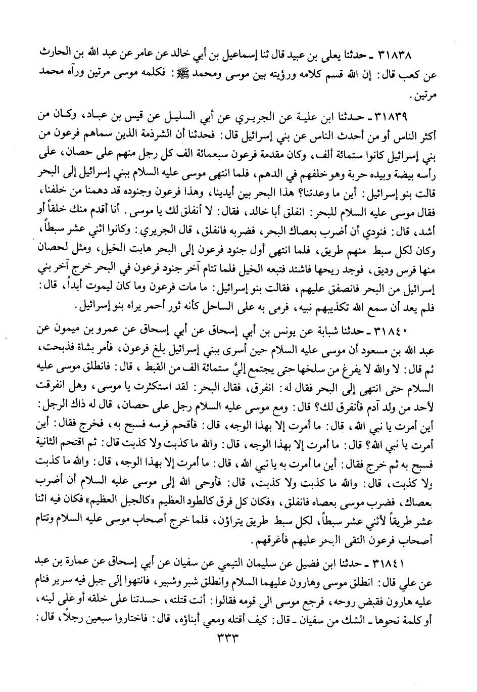 31840 - حَدَّثَنَا شَبَابَةُ، عَنْ يُونُسَ بْنِ أَبِي إِسْحَاقَ، عَنْ أَبِي إِسْحَاقَ، عَنْ عَمْرِو بْنِ مَيْمُونٍ، عَنْ عَبْدِ اللَّهِ بْنِ مَسْعُودٍ، " أَنَّ §مُوسَى عَلَيْهِ السَّلَامُ حِينَ أَسْرَى بِبَنِي إِسْرَائِيلَ بَلَغَ فِرْعَوْنَ، فَأَمَرَ بِشَاةٍ فَذُبِحَتْ، ثُمَّ قَالَ: لَا وَاللَّهِ لَا يُفْرَغُ مِنْ سَلْخِهَا حَتَّى يَجْتَمِعَ إِلَيَّ سِتُّمِائَةِ أَلْفٍ مِنَ الْقِبْطِ، قَالَ: فَانْطَلَقَ مُوسَى عَلَيْهِ السَّلَامُ حَتَّى انْتَهَى إِلَى الْبَحْرِ فَقَالَ لَهُ: انْفَرِقْ، فَقَالَ الْبَحْرُ: لَقَدِ اسْتَكْثَرْتَ يَا مُوسَى، وَهَلِ انْفَرَقْتُ لِأَحَدٍ مِنْ وَلَدِ آدَمَ فَأَنْفَرِقَ لَكَ؟ قَالَ: وَمَعَ مُوسَى عَلَيْهِ السَّلَامُ رَجُلٌ عَلَى حِصَانٍ، قَالَ لَهُ ذَاكَ الرَّجُلُ: أَيْنَ أُمِرْتَ يَا نَبِيَّ اللَّهِ، قَالَ: مَا أُمِرْتُ إِلَّا بِهَذَا الْوَجْهِ، قَالَ: فَأَقْحَمَ فَرَسَهُ فَسَبَحَ بِهِ، فَخَرَجَ فَقَالَ: أَيْنَ أُمِرْتَ يَا نَبِيَّ اللَّهِ؟ قَالَ: مَا أُمِرْتُ إِلَّا بِهَذَا الْوَجْهِ، قَالَ: وَاللَّهِ مَا كَذَبْتَ وَلَا كُذِّبْتَ، قَالَ: ثُمَّ اقْتَحَمَ الثَّانِيَةَ فَسَبَحَ بِهِ ثُمَّ خَرَجَ فَقَالَ: أَيْنَ مَا أُمِرْتَ بِهِ يَا نَبِيَّ اللَّهِ، قَالَ: مَا أُمِرْتُ إِلَّا بِهَذَا الْوَجْهِ، قَالَ: وَاللَّهِ مَا كَذَبْتَ وَلَا كُذِّبْتَ، قَالَ: فَأَوْحَى اللَّهُ إِلَى مُوسَى عَلَيْهِ السَّلَامُ أَنِ اضْرِبْ بِعَصَاكَ، فَضَرَبَ مُوسَى بِعَصَاهُ {فَانْفَلَقَ فَكَانَ كُلُّ فِرْقٍ كَالطَّوْدِ الْعَظِيمِ} [الشعراء: 63] كَالْجَبَلِ الْعَظِيمِ فَكَانَ فِيهِ اثْنَا عَشَرَ طَرِيقًا لِاثْنَيْ عَشَرَ سِبْطًا، لِكُلِّ سِبْطٍ طَرِيقٌ يَتَرَاءَوْنَ، فَلَمَّا خَرَجَ أَصْحَابُ مُوسَى عَلَيْهِ السَّلَامُ وَتَتَامَّ أَصْحَابُ فِرْعَوْنَ الْتَقَى الْبَحْرُ عَلَيْهِمْ فَأَغْرَقَهُمْ "