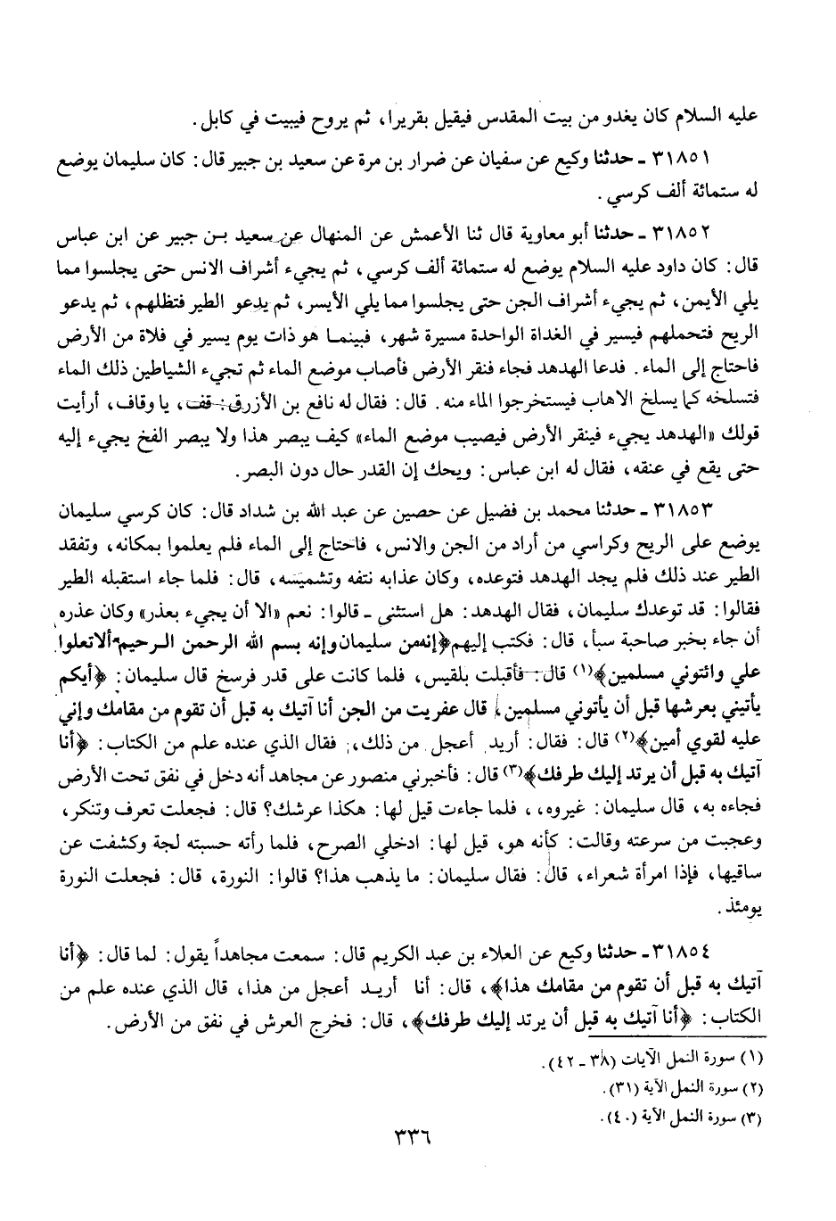 31851 - حَدَّثَنَا وَكِيعٌ، عَنْ سُفْيَانُ، عَنْ ضِرَارِ بْنِ مُرَّةَ، عَنْ سَعِيدِ بْنِ جُبَيْرٍ، قَالَ: «كَانَ §سُلَيْمَانُ يُوضَعُ لَهُ سِتُّمِائَةِ أَلْفِ كُرْسِيٍّ»
