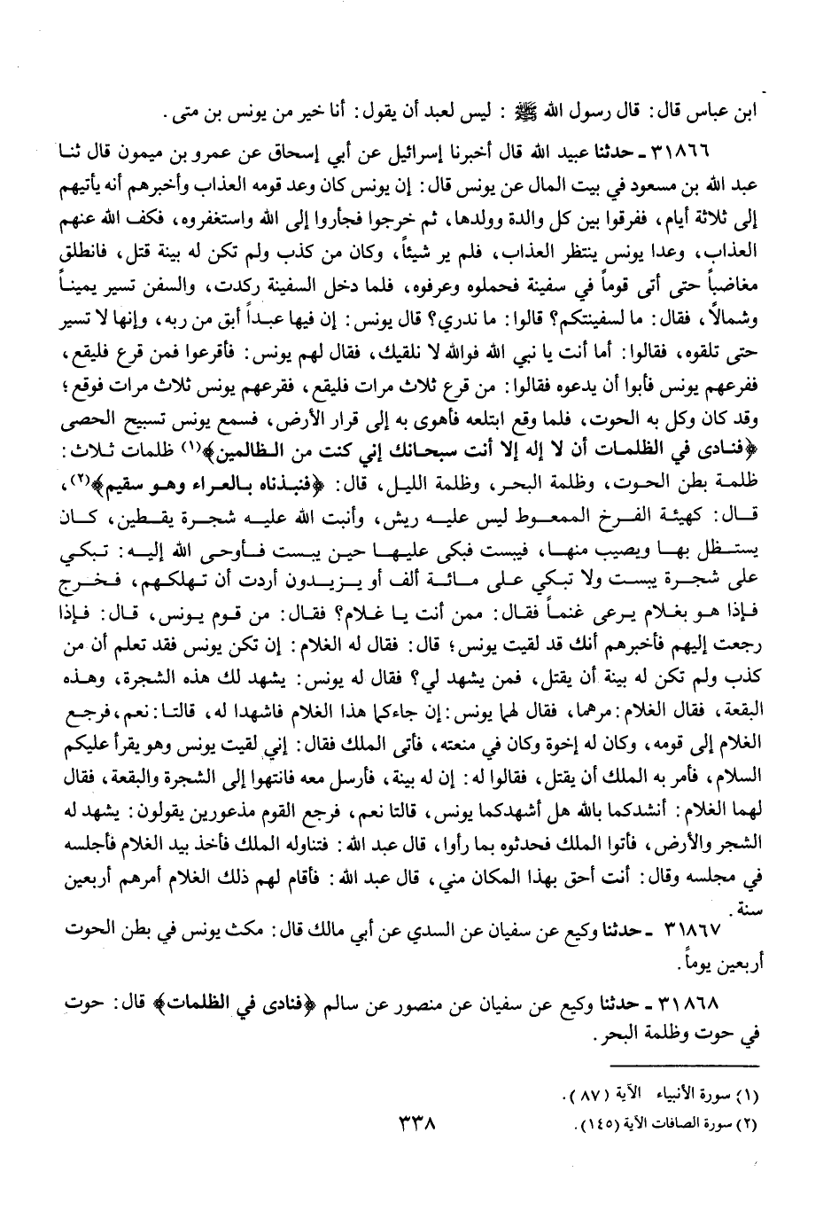 31867 - حَدَّثَنَا وَكِيعٌ، عَنْ سُفْيَانَ، عَنِ السُّدِّيِّ، عَنْ أَبِي مَالِكٍ، قَالَ: §مَكَثَ يُونُسُ فِي بَطْنِ الْحُوتِ أَرْبَعِينَ يَوْمًا "