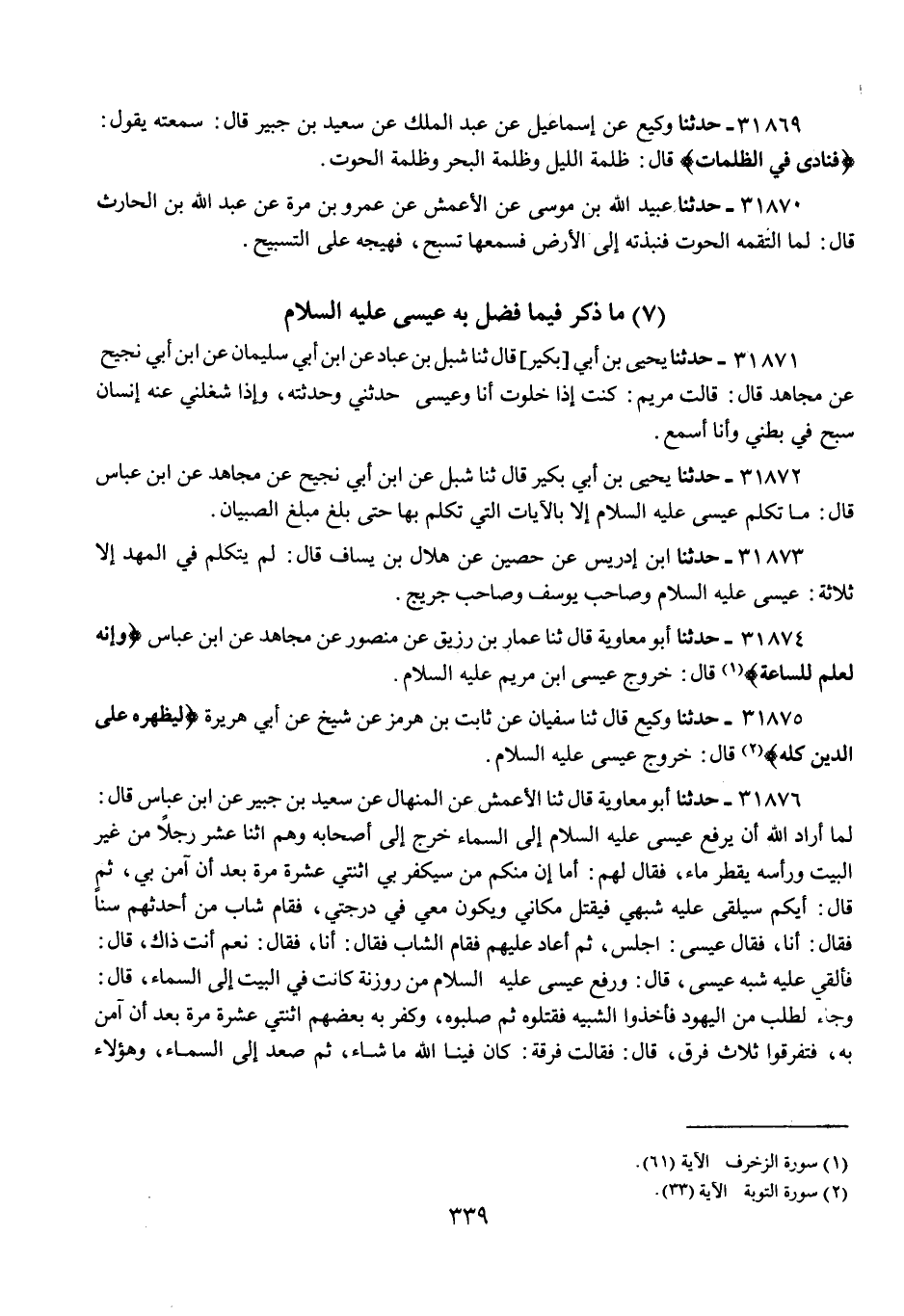 31876 - حَدَّثَنَا أَبُو مُعَاوِيَةَ، قَالَ: ثنا الْأَعْمَشُ، عَنِ الْمِنْهَالِ، عَنْ سَعِيدِ بْنِ جُبَيْرٍ، عَنِ ابْنِ عَبَّاسٍ، قَالَ: " لَمَّا §أَرَادَ اللَّهُ أَنْ يَرْفَعَ عِيسَى عَلَيْهِ السَّلَامُ إِلَى السَّمَاءِ خَرَجَ إِلَى أَصْحَابِهِ وَهُمُ اثْنَا عَشَرَ رَجُلًا مِنْ غَيْرِ الْبَيْتِ وَرَأْسُهُ يَقْطُرُ مَاءً، فَقَالَ لَهُمْ: أَمَا إِنَّ مِنْكُمْ مَنْ سَيَكْفُرُ بِي اثْنَتَيْ عَشْرَةَ مَرَّةً بَعْدَ أَنْ آمَنَ بِي، ثُمَّ قَالَ: أَيُّكُمْ سَيُلْقَى عَلَيْهِ شَبَهِي فَيُقْتَلُ مَكَانِي وَيَكُونُ مَعِي فِي دَرَجَتِي، فَقَامَ شَابٌّ مِنْ أَحْدَثِهِمْ سِنًّا فَقَالَ: أَنَا، فَقَالَ عِيسَى: اجْلِسْ، ثُمَّ أَعَادَ عَلَيْهِمْ فَقَامَ الشَّابُّ فَقَالَ: أَنَا، فَقَالَ: نَعَمْ أَنْتَ ذَاكَ، قَالَ: فَأُلْقِيَ عَلَيْهِ شَبَهُ عِيسَى، قَالَ: وَرُفِعَ عِيسَى عَلَيْهِ السَّلَامُ مِنْ رَوْزَنَةٍ كَانَتْ فِي الْبَيْتِ إِلَى السَّمَاءِ، قَالَ: وَجَاءَ الطَّلَبُ مِنَ الْيَهُودِ فَأَخَذُوا الشَّبِيهَ فَقَتَلُوهُ ثُمَّ صَلَبُوهُ، وَكَفَرَ بِهِ بَعْضُهُمُ اثْنَتَيْ عَشْرَةَ مَرَّةً بَعْدَ أَنْ آمَنَ بِهِ، فَتَفَرَّقُوا ثَلَاثَ فِرَقٍ، قَالَ: فَقَالَ فِرْقَةٌ: كَانَ فِينَا اللَّهُ مَا شَاءَ، ثُمَّ صَعِدَ إِلَى السَّمَاءِ، وَهَؤُلَاءِ -[340]- الْيَعْقُوبِيَّةُ وَقَالَتْ فِرْقَةٌ: كَانَ فِينَا ابْنُ اللَّهِ مَا شَاءَ ثُمَّ رَفَعَهُ اللَّهُ إِلَيْهِ، وَهَؤُلَاءِ النَّسْطُورِيَّةُ، وَقَالَتْ فِرْقَةٌ: كَانَ فِينَا عَبْدُ اللَّهِ وَرَسُولُهُ مَا شَاءَ اللَّهُ، ثُمَّ رَفَعَهُ اللَّهُ إِلَيْهِ وَهَؤُلَاءِ الْمُسْلِمُونَ، فَتَظَاهَرَتِ الْكَافِرَتَانِ عَلَى الْمُسْلِمَةِ فَقَاتَلُوهَا فَقَتَلُوهَا، فَلَمْ يَزَلِ الْإِسْلَامُ طَامِسًا حَتَّى بَعَثَ اللَّهُ مُحَمَّدًا صَلَّى اللهُ عَلَيْهِ وَسَلَّمَ، فَأَنْزَلَ اللَّهُ عَلَيْهِ {فَآمَنَتْ طَائِفَةٌ مِنْ بَنِي إِسْرَائِيلَ} [الصف: 14] يَعْنِي الطَّائِفَةَ الَّتِي آمَنَتْ فِي زَمَنِ عِيسَى، {وَكَفَرَتْ طَائِفَةٌ} [الصف: 14] يَعْنِي الطَّائِفَةَ الَّتِي كَفَرَتْ فِي زَمَنِ عِيسَى {فَأَيَّدْنَا الَّذِينَ آمَنُوا} [الصف: 14] فِي زَمَانِ عِيسَى {عَلَى عَدُوِّهِمْ} [الصف: 14] بِإِظْهَارِ مُحَمَّدٍ صَلَّى اللهُ عَلَيْهِ وَسَلَّمَ دِينَهُمْ عَلَى دِينِ الْكُفَّارِ {فَأَصْبَحُوا ظَاهِرِينَ} [الصف: 14] "