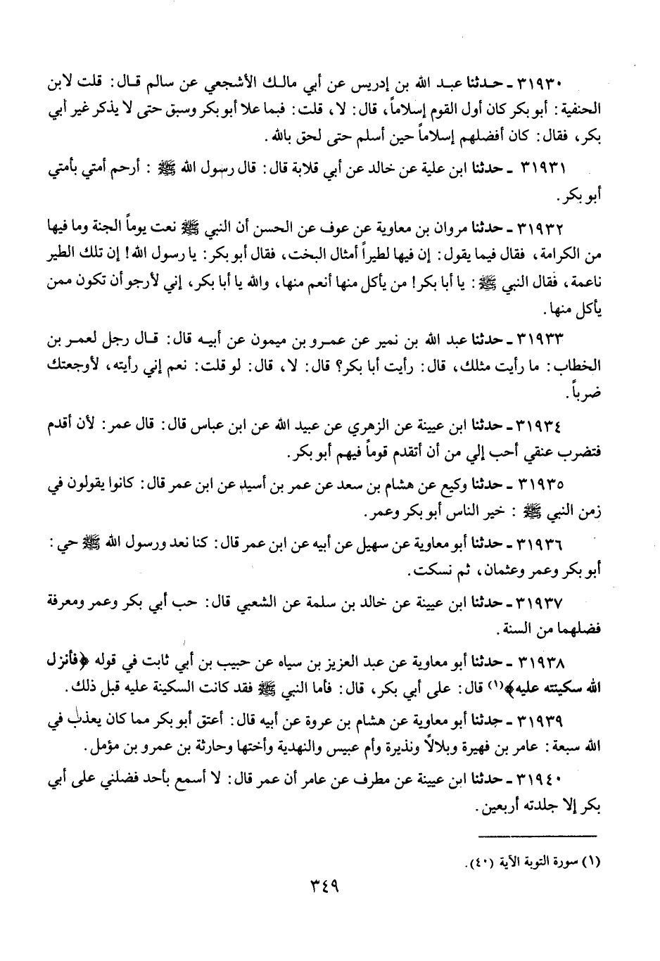 31940 - حَدَّثَنَا ابْنُ عُيَيْنَةَ، عَنْ مُطَرِّفٍ، عَنْ عَامِرٍ، أَنَّ عُمَرَ، قَالَ: «§لَا أَسْمَعُ بِأَحَدٍ فَضَّلَنِي عَلَى أَبِي بَكْرٍ إِلَّا جَلَدْتُهُ أَرْبَعِينَ»