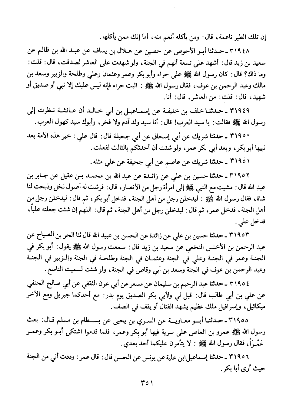 31953 - حَدَّثَنَا حُسَيْنُ بْنُ عَلِيٍّ، عَنْ زَائِدَةَ، عَنِ الْحَسَنِ بْنِ عُبَيْدِ اللَّهِ، قَالَ: ثنا الْحُرُّ بْنُ الصَّيَّاحِ، عَنْ عَبْدِ الرَّحْمَنِ بْنِ الْأَخْنَسِ النَّخَعِيِّ، عَنْ سَعِيدِ بْنِ زَيْدٍ، قَالَ: سَمِعْتُ رَسُولَ اللَّهِ صَلَّى اللهُ عَلَيْهِ وَسَلَّمَ يَقُولُ: «§أَبُو بَكْرٍ فِي الْجَنَّةِ، وَعُمَرُ فِي الْجَنَّةِ، وَعَلِيٌّ وَعُثْمَانُ فِي الْجَنَّةِ، وَطَلْحَةُ فِي الْجَنَّةِ، وَالزُّبَيْرُ فِي الْجَنَّةِ، وَعَبْدُ الرَّحْمَنِ بْنُ عَوْفٍ فِي الْجَنَّةِ، وَسَعْدُ بْنُ أَبِي وَقَّاصٍ فِي الْجَنَّةِ، وَلَوْ شِئْتُ لَسَمَّيْتُ التَّاسِعَ»