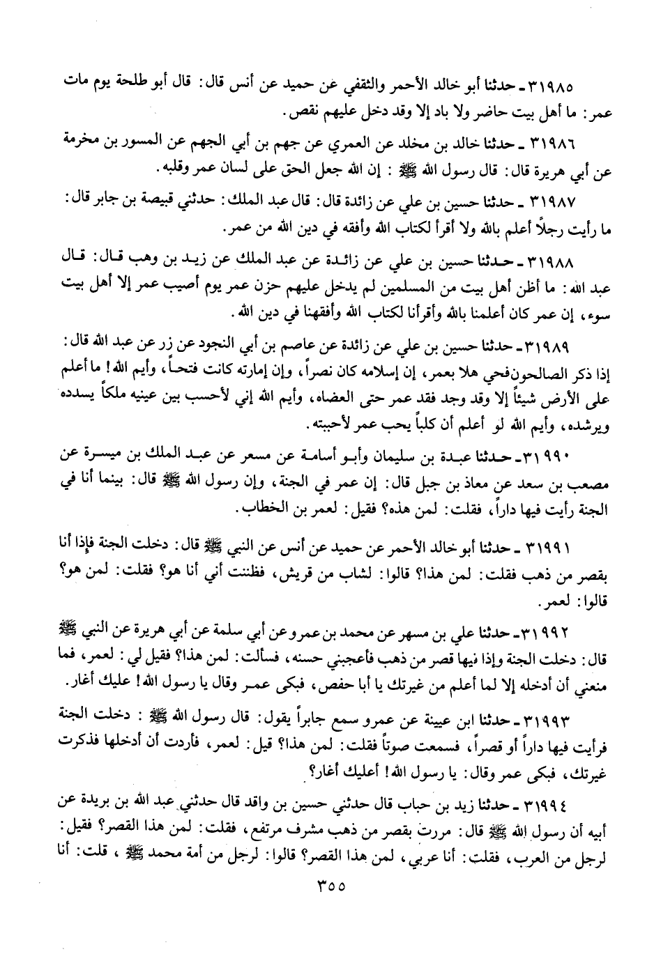 31994 - حَدَّثَنَا زَيْدُ بْنُ الْحُبَابِ، قَالَ: حَدَّثَنِي حُسَيْنُ بْنُ وَاقِدٍ، قَالَ: حَدَّثَنِي عَبْدُ اللَّهِ بْنُ بُرَيْدَةَ، عَنْ أَبِيهِ، أَنَّ رَسُولَ اللَّهِ صَلَّى اللهُ عَلَيْهِ وَسَلَّمَ قَالَ: " §مَرَرْتُ بِقَصْرٍ مِنْ ذَهَبٍ مُشْرِفٍ مُرْتَفِعٍ، فَقُلْتُ: لِمَنْ هَذَا الْقَصْرُ؟ " فَقِيلَ: لِرَجُلٍ مِنَ الْعَرَبِ، فَقُلْتُ: «أَنَا عَرَبِيٌّ، لِمَنْ هَذَا الْقَصْرُ؟» قَالُوا: لِرَجُلٍ مِنْ أُمَّةِ مُحَمَّدٍ صَلَّى اللهُ عَلَيْهِ وَسَلَّمَ، قُلْتُ: «أَنَا مُحَمَّدٌ، لِمَنْ هَذَا الْقَصْرُ؟» قَالُوا: لِعُمَرَ بْنِ الْخَطَّابِ