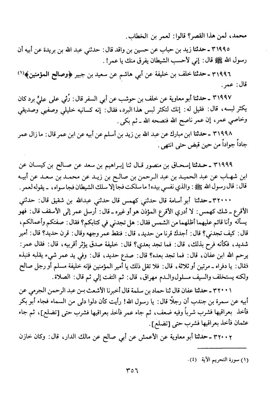31995 - حَدَّثَنَا زَيْدُ بْنُ الْحُبَابِ، عَنْ حُسَيْنِ بْنِ وَاقِدٍ، قَالَ: حَدَّثَنِي عَبْدُ اللَّهِ بْنُ بُرَيْدَةَ، عَنْ أَبِيهِ، أَنَّ رَسُولَ اللَّهِ صَلَّى اللهُ عَلَيْهِ وَسَلَّمَ قَالَ: «§إِنِّي لَأَحْسَبُ الشَّيْطَانَ يَفْرَقُ مِنْكَ يَا عُمَرُ»