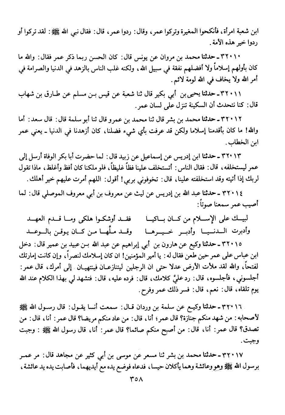 32015 - حَدَّثَنَا وَكِيعٌ، عَنْ هَارُونَ بْنِ أَبِي إِبْرَاهِيمَ، عَنْ عَبْدِ اللَّهِ بْنِ عُبَيْدِ بْنِ عُمَيْرٍ، قَالَ: دَخَلَ ابْنُ عَبَّاسٍ عَلَى عُمَرَ حِينَ طُعِنَ فَقَالَ لَهُ: يَا أَمِيرَ الْمُؤْمِنِينَ، إِنْ كَانَ §إِسْلَامُكَ لَنَصْرًا، وَإِنْ كَانَتْ إِمَارَتُكَ لَفَتْحًا، وَاللَّهِ لَقَدْ مَلَأْتَ الْأَرْضَ عَدْلًا حَتَّى إِنَّ الرَّجُلَيْنِ لَيَتَنَازَعَانِ فَيَنْتَهِيَانِ إِلَى أَمْرِكَ، قَالَ عُمَرُ: «أَجْلِسُونِي»، فَأَجْلَسُوهُ، قَالَ: «رُدَّ عَلَيَّ كَلَامَكَ»، قَالَ: فَرَدَّهُ عَلَيْهِ، قَالَ: «فَتَشْهَدُ لِي بِهَذَا الْكَلَامِ عِنْدَ اللَّهِ يَوْمَ تَلْقَاهُ»، قَالَ: «نَعَمْ»، قَالَ: فَسَّرَ ذَلِكَ عُمَرَ وَفَرِحَ