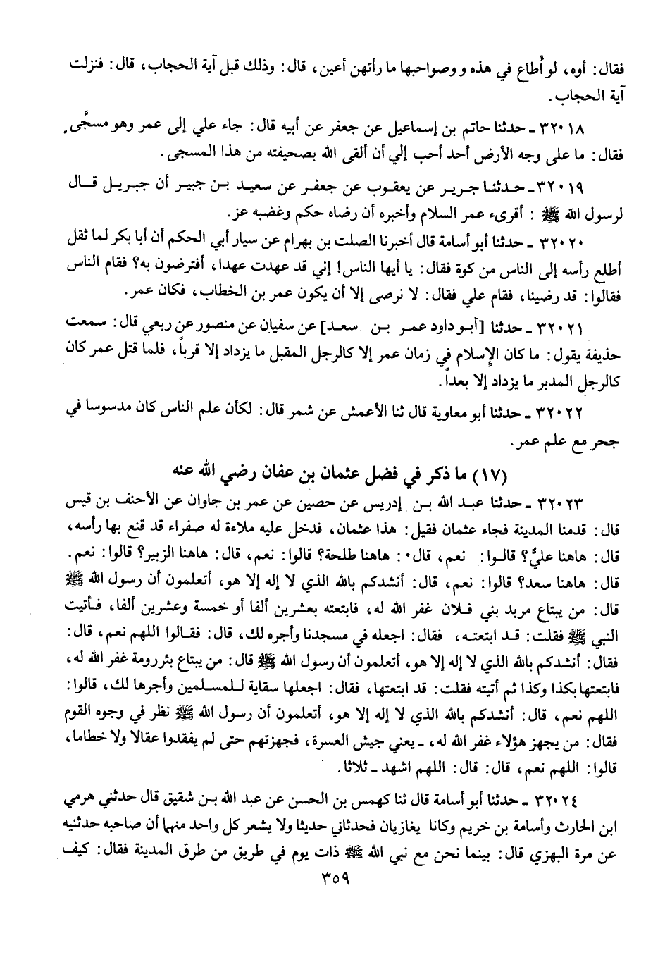 32023 - حَدَّثَنَا عَبْدُ اللَّهِ بْنُ إِدْرِيسَ، عَنْ حُصَيْنٍ، عَنْ عُمَرَ بْنِ جَاوَانَ، عَنِ الْأَحْنَفِ بْنِ قَيْسٍ، قَالَ: قَدِمْنَا الْمَدِينَةَ فَجَاءَ عُثْمَانُ فَقِيلَ: هَذَا عُثْمَانُ، فَدَخَلَ عَلَيْهِ مُلَاءَةٌ لَهُ صَفْرَاءُ قَدْ قَنَّعَ بِهَا رَأْسَهُ، قَالَ: هَا هُنَا عَلِيٌّ؟ قَالُوا: نَعَمْ، قَالَ: هَاهُنَا طَلْحَةُ؟ قَالُوا: نَعَمْ، قَالَ: هَاهُنَا الزُّبَيْرُ؟ قَالُوا: نَعَمْ، قَالَ: هَاهُنَا سَعْدٌ؟ قَالُوا: نَعَمْ، قَالَ: أَنْشُدُكُمْ بِاللَّهِ الَّذِي لَا إِلَهَ إِلَّا هُوَ، أَتَعْلَمُونَ أَنَّ رَسُولَ اللَّهِ صَلَّى اللهُ عَلَيْهِ وَسَلَّمَ، قَالَ: «§مَنْ يَبْتَاعُ مِرْبَدَ بَنِي فُلَانٍ غَفَرَ اللَّهُ لَهُ»، فَابْتَعْتُهُ بِعِشْرِينَ أَلْفًا أَوْ خَمْسَةٍ وَعِشْرِينَ أَلْفًا، فَأَتَيْتُ النَّبِيَّ صَلَّى اللهُ عَلَيْهِ وَسَلَّمَ فَقُلْتُ: قَدِ ابْتَعْتُهُ، فَقَالَ: «اجْعَلْهُ فِي مَسْجِدِنَا وَأَجْرُهُ لَكَ»، قَالَ: فَقَالُوا: اللَّهُمَّ نَعَمْ