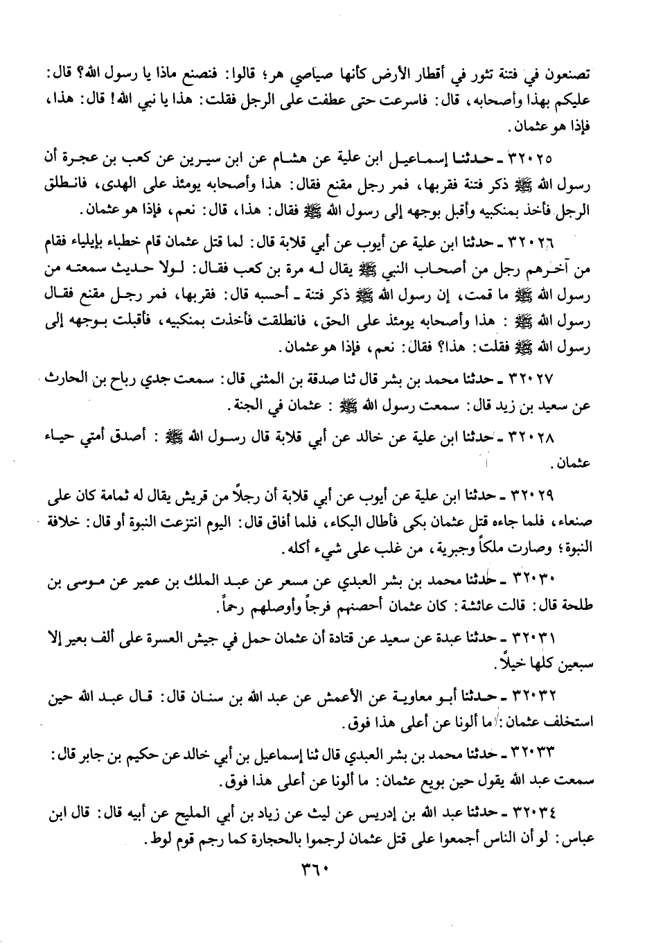 32025 - حَدَّثَنَا إِسْمَاعِيلُ ابْنُ عُلَيَّةَ، عَنْ هِشَامٍ، عَنِ ابْنِ سِيرِينَ، عَنْ كَعْبِ بْنِ عُجْرَةَ، أَنَّ رَسُولَ اللَّهِ صَلَّى اللهُ عَلَيْهِ وَسَلَّمَ ذَكَرَ فِتْنَةً فَقَرَّبَهَا، فَمَرَّ رَجُلٌ مُقَنَّعٌ فَقَالَ: «§هَذَا وَأَصْحَابُهُ يَوْمَئِذٍ عَلَى الْهُدَى» فَانْطَلَقَ الرَّجُلُ فَأَخَذَ بِمَنْكِبَيْهِ، وَأَقْبَلَ بِوَجْهِهِ إِلَى رَسُولِ اللَّهِ صَلَّى اللهُ عَلَيْهِ وَسَلَّمَ فَقَالَ: هَذَا، قَالَ: «نَعَمْ»، فَإِذَا هُوَ عُثْمَانُ