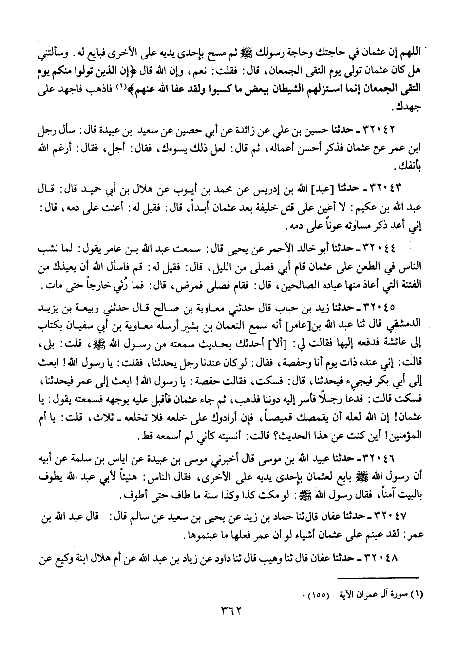 32045 - حَدَّثَنَا زَيْدُ بْنُ الْحُبَابِ، قَالَ: حَدَّثَنِي مُعَاوِيَةُ بْنُ صَالِحٍ، قَالَ: حَدَّثَنِي رَبِيعَةُ بْنُ يَزِيدَ الدِّمَشْقِيُّ، قَالَ: ثنا عَبْدُ اللَّهِ بْنُ قَيْسٍ، أَنَّهُ سَمِعَ النُّعْمَانَ بْنَ بَشِيرٍ، أَنَّهُ أَرْسَلَهُ مُعَاوِيَةُ بْنُ أَبِي سُفْيَانَ بِكِتَابٍ إِلَى عَائِشَةَ فَدَفَعَهُ إِلَيْهَا، فَقَالَتْ لِي: أَنَا أُحَدِّثُكَ بِحَدِيثٍ سَمِعْتُهُ مِنْ رَسُولِ اللَّهِ صَلَّى اللهُ عَلَيْهِ وَسَلَّمَ، قُلْتُ: بَلَى، قَالَتْ: إِنِّي عنْدَهُ ذَاتَ يَوْمٍ، أَنَا وَحَفْصَةُ، فَقَالَ: «لَوْ كَانَ عِنْدَنَا رَجُلٌ يُحَدِّثُنَا»، فَقُلْتُ: يَا رَسُولَ اللَّهِ، أَبْعَثُ إِلَى أَبِي بَكْرٍ فَيَجِيءُ فَيُحَدِّثُنَا، قَالَ: فَسَكَتَ، فَقَالَتْ حَفْصَةُ: يَا رَسُولَ اللَّهِ، أَبْعَثُ إِلَى عُمَرَ فَيُحَدِّثُنَا، فَسَكَتَ، قَالَتْ: فَدَعَا رَجُلًا فَأسَرَّ إِلَيْهِ دُونَنَا فَذَهَبَ، ثُمَّ جَاءَ عُثْمَانُ فَأَقْبَلَ عَلَيْهِ بِوَجْهِهِ فَسَمِعْتُهُ يَقُولُ: «يَا عُثْمَانُ، إِنَّ §اللَّهَ لَعَلَّهُ أَنْ يُقْمِصَكَ قَمِيصًا، فَإِنْ أَرَادُوكَ عَلَى خَلْعِهِ فَلَا تَخْلَعْهُ» ثَلَاثًا، قُلْتُ: يَا أُمَّ الْمُؤْمِنِينَ، أَيْنَ كُنْتِ عَنْ هَذَا الْحَدِيثِ؟ قَالَتْ: أُنْسِيتُهُ كَأَنِّي لَمْ أَسْمَعْهُ قَطُّ