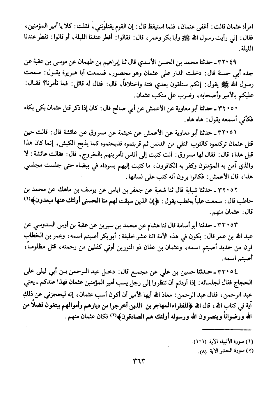 32054 - حَدَّثَنَا حُسَيْنُ بْنُ عَلِيٍّ، عَنْ مُجَمِّعٍ، قَالَ: دَخَلَ عَبْدُ الرَّحْمَنِ بْنُ أَبِي لَيْلَى عَلَى الْحَجَّاجِ فَقَالَ لِجُلَسَائِهِ: «§إِذَا أَرَدْتُمْ أَنْ تَنْظُرُوا إِلَى رَجُلٍ يَسُبُّ أَمِيرَ الْمُؤْمِنِينَ عُثْمَانَ فَهَذَا عِنْدَكُمْ - يَعْنِي عَبْدَ الرَّحْمَنِ -»، فَقَالَ عَبْدُ الرَّحْمَنِ: مَعَاذَ اللَّهِ أَيُّهَا الْأَمِيرُ أَنْ أَكُونَ أَسُبُّ عُثْمَانَ، إِنَّهُ لَيَحْجِزُنِي عَنْ ذَلِكَ آيَةٌ فِي كِتَابِ اللَّهِ، قَالَ اللَّهُ: {لِلْفُقَرَاءِ الْمُهَاجِرِينَ الَّذِينَ أُخْرِجُوا مِنْ دِيَارِهِمْ وَأَمْوَالِهِمْ يَبْتَغُونَ فَضْلًا مِنَ اللَّهِ وَرِضْوَانًا وَيَنْصُرُونَ اللَّهَ وَرَسُولَهُ أُولَئِكَ هُمُ الصَّادِقُونَ} [الحشر: 8] فَكَانَ عُثْمَانُ مِنْهُمْ