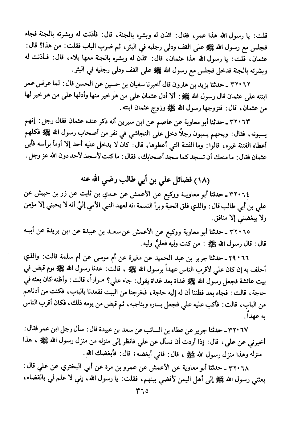 32065 - حَدَّثَنَا أَبُو مُعَاوِيَةَ، وَوَكِيعٌ، عَنِ الْأَعْمَشِ، عَنْ سَعْدِ بْنِ عُبَيْدَةَ، عَنِ ابْنِ بُرَيْدَةَ، عَنْ أَبِيهِ، قَالَ: قَالَ رَسُولُ اللَّهِ صَلَّى اللهُ عَلَيْهِ وَسَلَّمَ: «§مَنْ كُنْتُ وَلِيَّهُ فَعَلِيٌّ وَلِيُّهُ»
