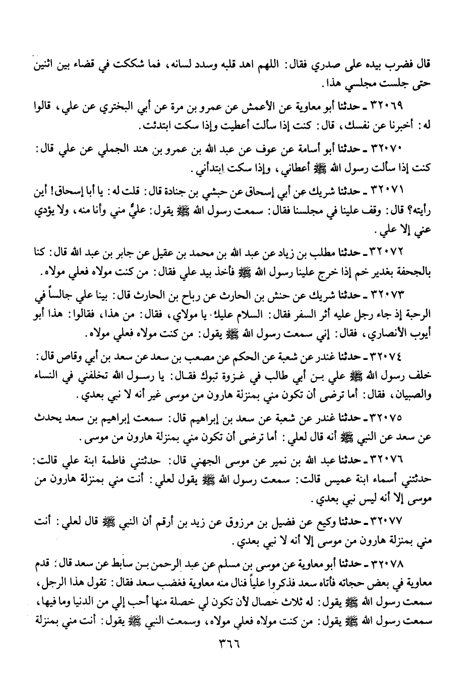 32074 - حَدَّثَنَا غُنْدَرٌ، عَنْ شُعْبَةَ، عَنِ الْحَكَمِ، عَنْ مُصْعَبِ بْنِ سَعْدٍ، عَنْ سَعْدِ بْنِ أَبِي وَقَّاصٍ، قَالَ: خَلَّفَ رَسُولُ اللَّهِ صَلَّى اللهُ عَلَيْهِ وَسَلَّمَ، عَلِيَّ بْنَ أَبِي طَالِبٍ فِي غَزْوَةِ تَبُوكَ فَقَالَ: يَا رَسُولَ اللَّهِ تُخَلِّفُنِي فِي النِّسَاءِ وَالصِّبْيَانِ، فَقَالَ: «§أَمَا تَرْضَى أَنْ تَكُونَ مِنِّي بِمَنْزِلَةِ هَارُونَ مِنْ مُوسَى غَيْرَ أَنَّهُ لَا نَبِيَّ بَعْدِي»