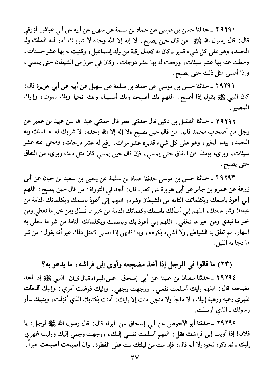 29295 - حَدَّثَنَا أَبُو الْأَحْوَصِ، عَنْ أَبِي إِسْحَاقَ، عَنِ الْبَرَاءِ، قَالَ: قَالَ رَسُولُ اللَّهِ صَلَّى اللهُ عَلَيْهِ وَسَلَّمَ لِرَجُلٍ: " يَا فُلَانُ §إِذَا أَوَيْتَ إِلَى فِرَاشِكَ، فَقُلِ: اللَّهُمَّ أَسْلَمْتُ نَفْسِي إِلَيْكَ، وَوَجَّهْتُ وَجْهِي إِلَيْكَ، وَوَلَّيْتُ ظَهْرِي إِلَيْكَ "، ثُمَّ ذَكَرَ نَحْوَهُ إِلَّا أَنَّهُ قَالَ: «فَإِنْ مِتَّ مِنْ لَيْلَتِكَ مِتَّ عَلَى الْفِطْرَةِ، وَإِنْ أَصْبَحْتَ أَصْبَحْتُ خَيْرًا»