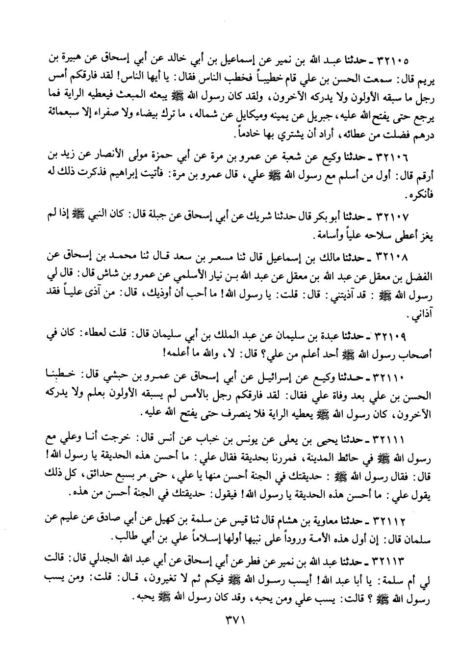 32112 - حَدَّثَنَا مُعَاوِيَةُ بْنُ هِشَامٍ قَالَ: ثنا قَيْسٌ عَنْ سَلَمَةَ بْنِ كُهَيْلٍ عَنْ أَبِي صَادِقٍ عَنْ عُلَيْمٍ عَنْ سَلْمَانَ قَالَ: «إِنَّ §أَوَّلَ هَذِهِ الْأُمَّةِ وُرُودًا عَلَى نَبِيِّهَا أَوَّلُهَا إِسْلَامًا عَلِيُّ بْنُ أَبِي طَالِبٍ»
