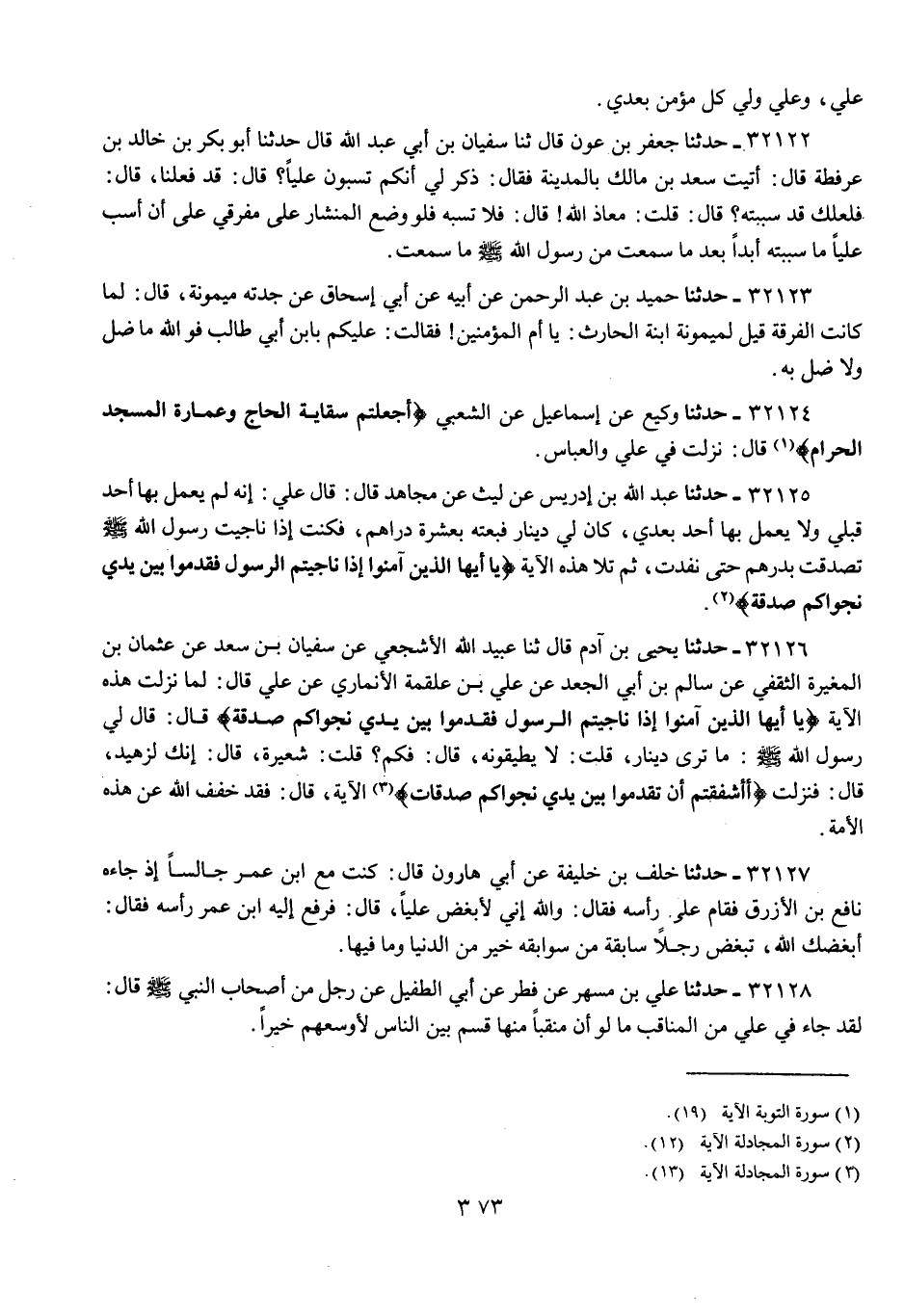 32126 - حَدَّثَنَا يَحْيَى بْنُ آدَمَ قَالَ: ثنا عُبَيْدُ اللَّهِ الْأَشْجَعِيُّ عَنْ سُفْيَانَ بْنِ سَعِيدٍ عَنْ عُثْمَانَ بْنِ الْمُغِيرَةِ الثَّقَفِيِّ عَنْ سَالِمِ بْنِ أَبِي الْجَعْدِ عَنْ عَلِيِّ بْنِ عَلْقَمَةَ الْأَنْمَارِيِّ عَنْ عَلِيٍّ قَالَ: لَمَّا نَزَلَتْ هَذِهِ الْآيَةُ: {§يَا أَيُّهَا الَّذِينَ آمَنُوا إِذَا نَاجَيْتُمُ الرَّسُولَ فَقَدِّمُوا بَيْنَ يَدَيْ نَجْوَاكُمْ صَدَقَةً} [المجادلة: 12] قَالَ: قَالَ لِي رَسُولُ اللَّهِ صَلَّى اللهُ عَلَيْهِ وَسَلَّمَ: «مَا تَرَى دِينَارًا» , قُلْتُ: لَا يُطِيقُونَهُ , قَالَ: «فَكَمْ؟» قُلْتُ: شَعِيرَةٌ , قَالَ: «إِنَّكَ لَزَهِيدٌ» , قَالَ , فَنَزَلَتْ: {أَأَشْفَقْتُمْ أَنْ تُقَدِّمُوا بَيْنَ يَدَيْ نَجْوَاكُمْ صَدَقَاتٍ} [المجادلة: 13] الْآيَةَ , قَالَ: فَقَدْ خَفَّفَ اللَّهُ عَنْ هَذِهِ الْأُمَّةِ