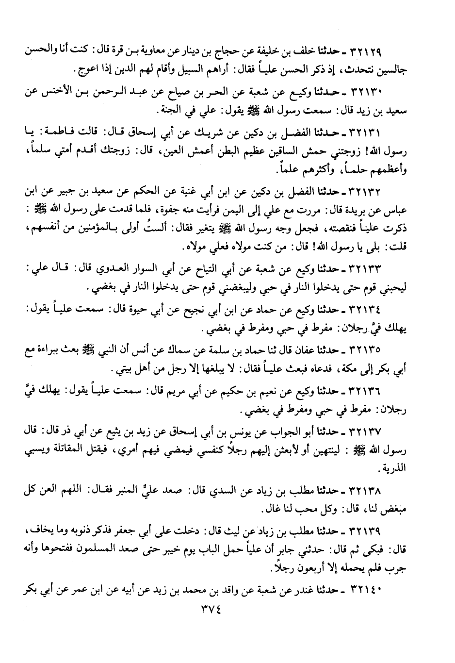 32130 - حَدَّثَنَا وَكِيعٌ عَنْ شُعْبَةَ عَنِ الْحُرِّ بْنِ الصَّيَّاحِ عَنْ عَبْدِ الرَّحْمَنِ بْنِ الْأَخْنَسِ عَنْ سَعِيدِ بْنِ زَيْدٍ قَالَ: سَمِعْتُ رَسُولَ اللَّهِ صَلَّى اللهُ عَلَيْهِ وَسَلَّمَ يَقُولُ: «§عَلِيٌّ فِي الْجَنَّةِ»