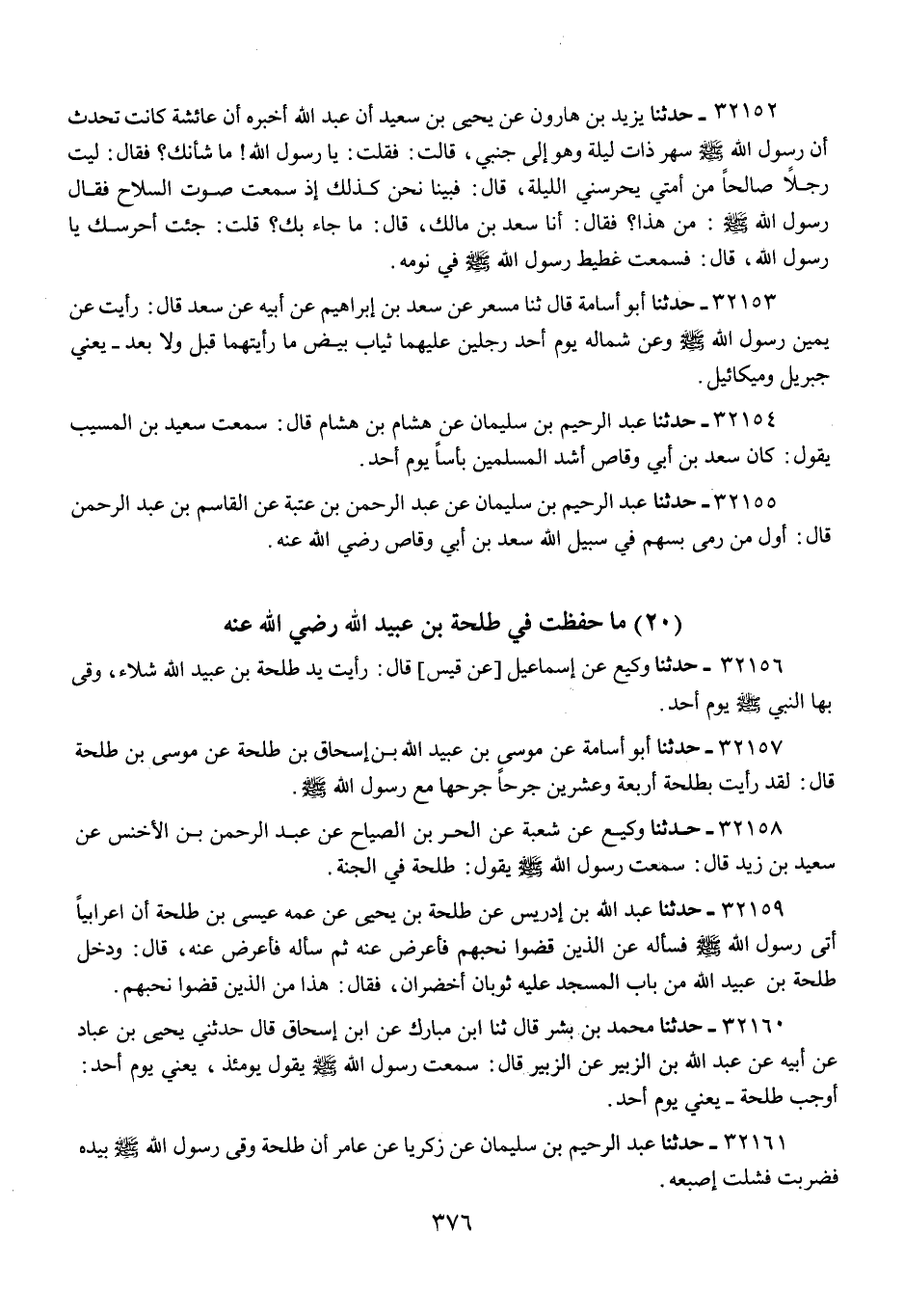 32161 - حَدَّثَنَا عَبْدُ الرَّحِيمِ بْنُ سُلَيْمَانَ، عَنْ زَكَرِيَّا، عَنْ عَامِرٍ، «أَنَّ §طَلْحَةَ وَقَى رَسُولَ اللَّهِ صَلَّى اللهُ عَلَيْهِ وَسَلَّمَ، بِيَدِهِ فَضُرِبَتْ فَشَلَّتْ إِصْبَعُهُ»